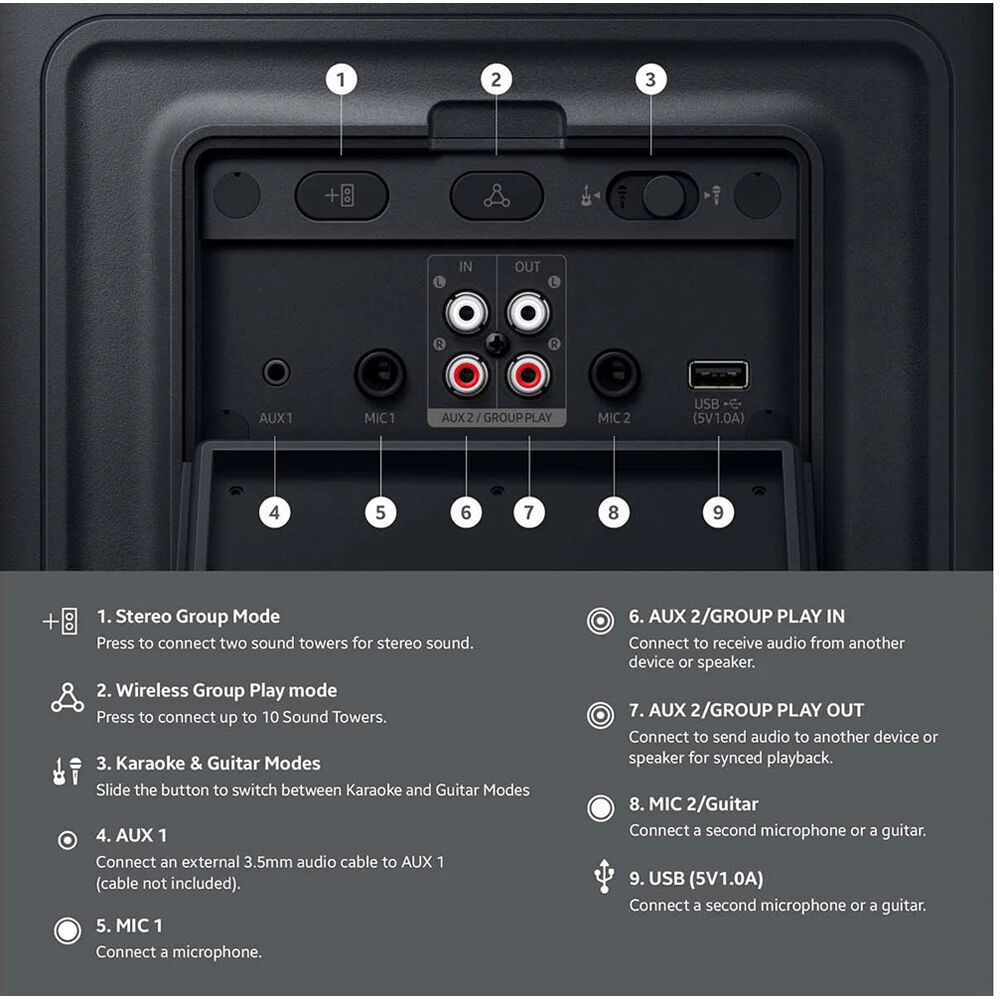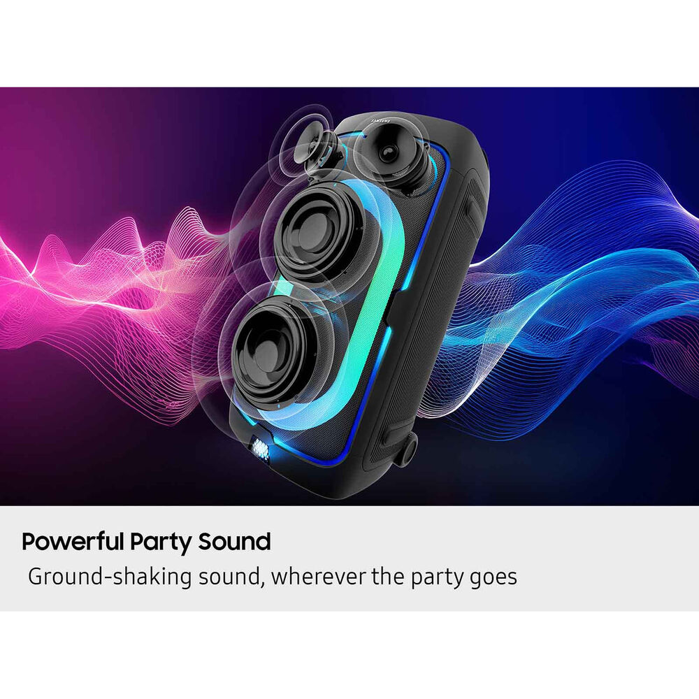 Samsung MX-ST50F 240W Sound Tower Party Speaker and give your guests more than just music. This large party speaker lets you stream music from a Bluetooth device through a pair of woofers and tweeters for up to 240W via AC (up to 90W via battery) of balanced audio power. If you need more boom, customize the sound with three bass modes. If you have a guitar or optional mics, you can showcase your guests' musical and karaoke singing talents to mix things up. Dynamic Party Lights+ adds club-style lighting effects to enhance whatever you play or sing. Great parties tend to grow, and you can expand your sound with additional speakers using Auracast or stereo pairing via Bluetooth multiconnection.