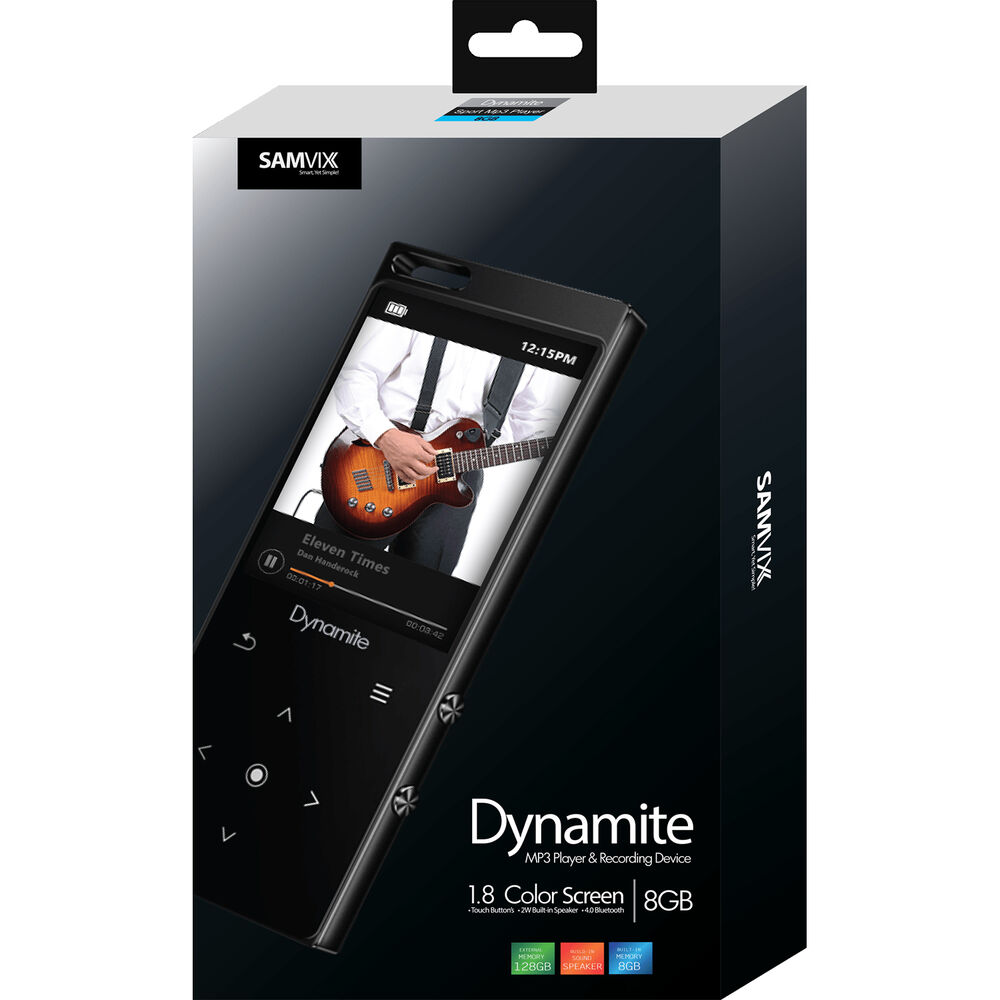 The stylish silver-colored Dynamite 8GB Sport MP3 Player from Samvix features a metallic body, 1.8" color display and intuitive touch controls. Listen to music and other audio files from its 8GB of built-in storage, which can be expanded up to 64GB with an optional SD card. Samvix gives you three ways to enjoy your content. Listen through the built-in speaker, use the included earphones, or pair an optional Bluetooth headset for wireless playback. You can also use the storage with the integrated microphone to take notes and other recordings.