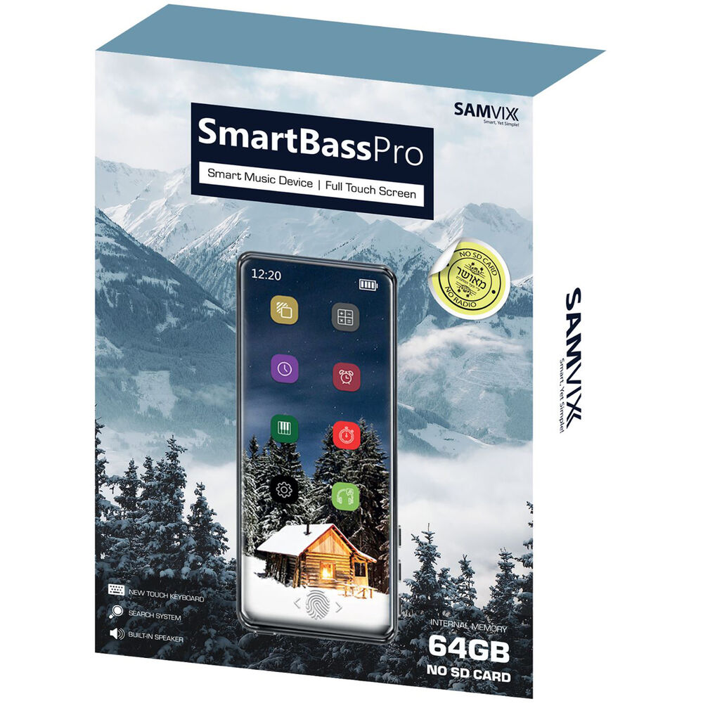 Enjoy modern functionality while enjoying Kosher-safe mobile entertainment with the SmartBass Pro 64GB MP3 Player from Samvix. Kosher safe for all ages, the SmartBass has no SD slot, video, radio, Wi-Fi, or Android operating system. What it does have is smartphone-like features, a built-in voice recorder, and 64GB of storage for your music, audio books, and personal reminders. Use the full-color touchscreen display to search, organize, and play your media. SmartBass gives you three different ways to listen: Bluetooth, wired earphones, or through its built-in speaker.