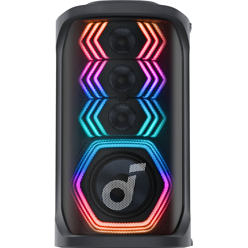 Soundcore by Anker. People can sing along to their favorite songs by using the included pair of wireless microphones and AI Vocal Removal. The feature allows singers to adjust vocal volume, using it as a guide on unfamiliar tracks or turning it off altogether to showcase their talent. There's also a guitar input for musicians to join in on the fun, or you can sit back and let the 200W of 108 dB audio fill the space with a favorite party playlist. Whatever song plays, a beat-synced multicolored light show makes the party complete.