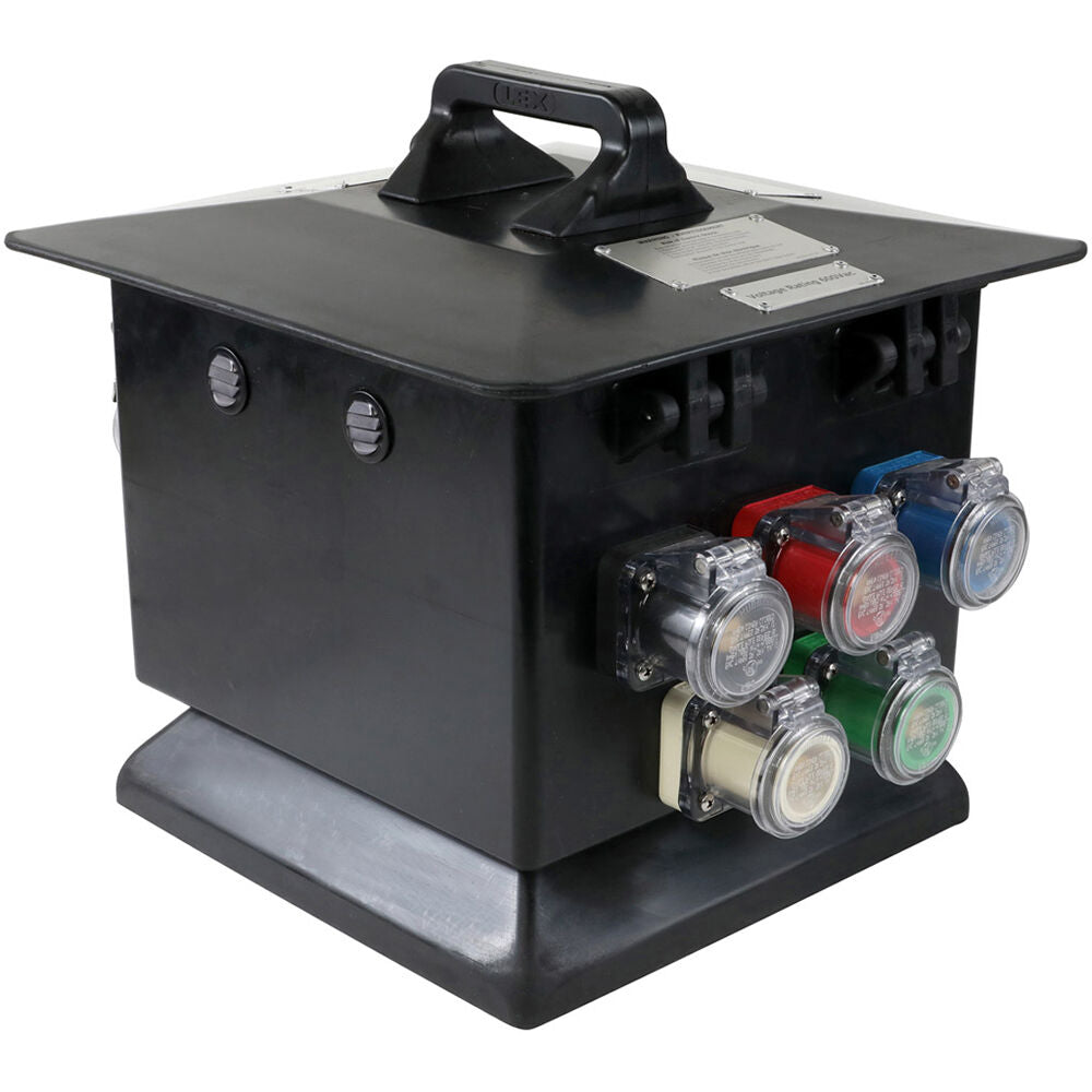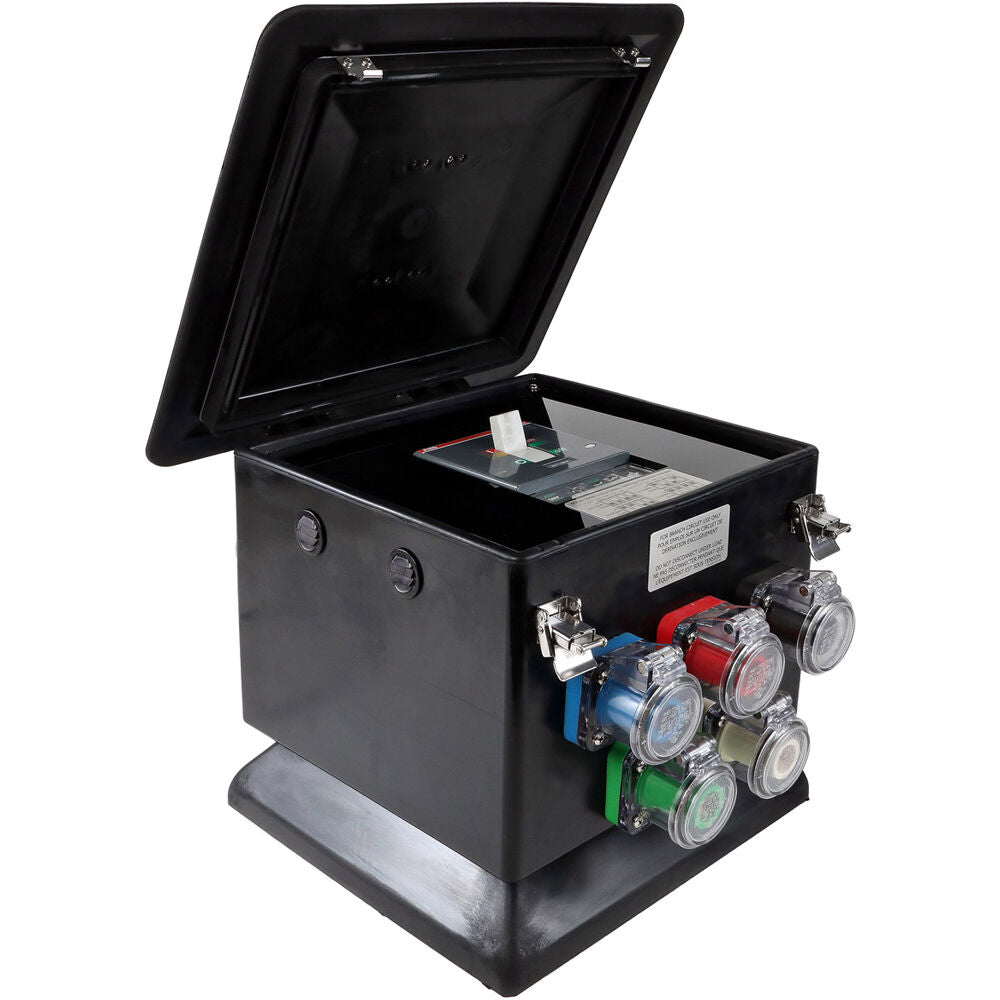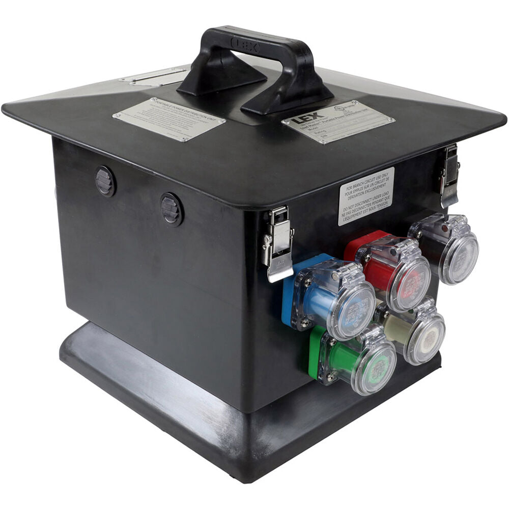The 160-400A Pagoda Load Master from Lex Products has a three-phase (H,H,H,N,G), 4-pole, 5-wire, 120/208Y VAC, 60 Hz rating, and it allows you to provide a main disconnect and overcurrent protection for portable power distribution systems. The current trip setting is adjustable, allowing it to protect a variety of systems with different cable sizes. The unit is made of heavy-duty molded rubber that is fully insulated and resistant to shock, impact, and corrosion. These particular characteristics make it ideal for use in shipyards, emergency and disaster relief, construction, outdoor events, concert touring, and entertainment markets.
