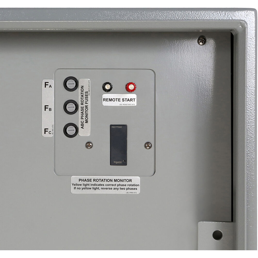 The panel's tamper-proof design reduces cable theft, and the 2-wire remote start terminals allow for remote control by a generator. You can quickly monitor the total loss of one or more phases and synchronization of phases. A Kirk Key Provision allows for the installation of a Kirk Key Type D Interlock to prevent two sources of active power at a time.