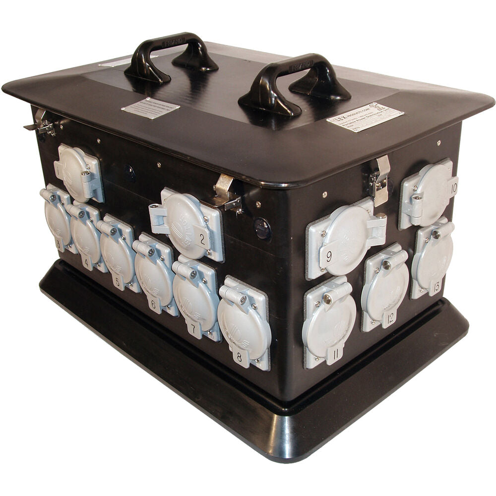 The input provides one set of five 16-Series, 400A, single-pole, single-wire, 600 VAC, BRBWG color-coded cover doors, cam-type inlets, and panel mount.The output contains twenty-one NEMA TT-30 (travel trailer), 30A, 2-pole, 3-wire, 125 VAC, straight-blade receptacle, cover doors, and panel mount.