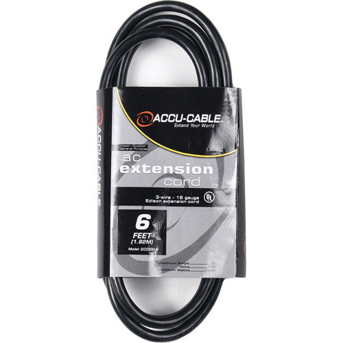 The 6' American DJ Accu-Cable Indoor/Outdoor General Purpose IEC Extension Cord is appropriate for both home and professional applications. The 3-wire 16-gauge cord features a ground prong and can extend the connection-cable length of a wide variety of electronics. The cord is rated to 13 amps, 125 volts, and a maximum of 1625 watts.