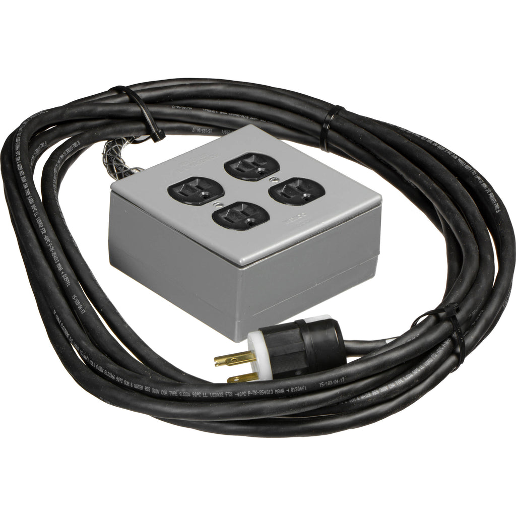This unit features a four-outlet cast-aluminum stage box with a basket strain relief. Its design also includes BR-15 outlets, 14/3 SJO rubber-coated power cable, and a terminated 5266C high-impact plug.