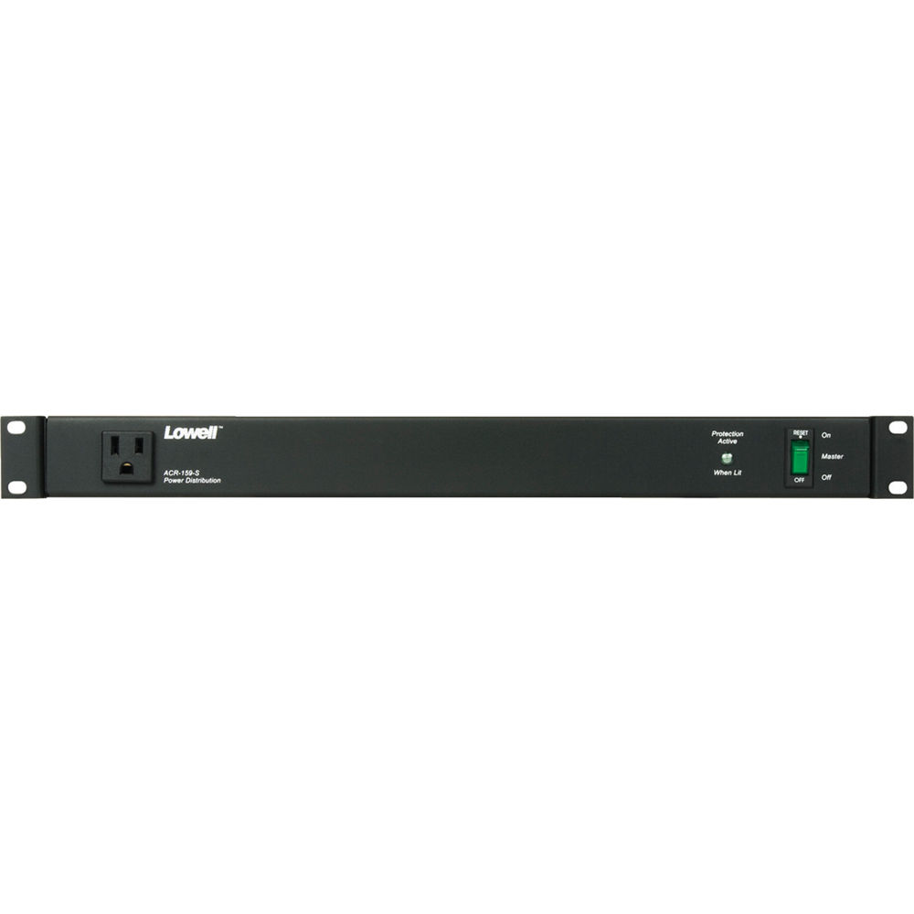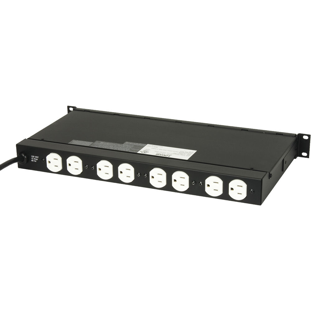 The 1 RU Rackmount Power Panel from Lowell Manufacturing features eight 15A rear outlets and one 15A front outlet and is designed with basic surge protection. It features a front activation rocker switch with a 15A circuit breaker. This panel has an attached 9' power cord with a NEMA 5-15 plug.