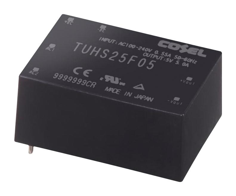 TUHS25F05 is a TUHS-series PCB mount AC-DC converter. Approved by UL60950-1, C-UL, EN62368-1 safety approval.