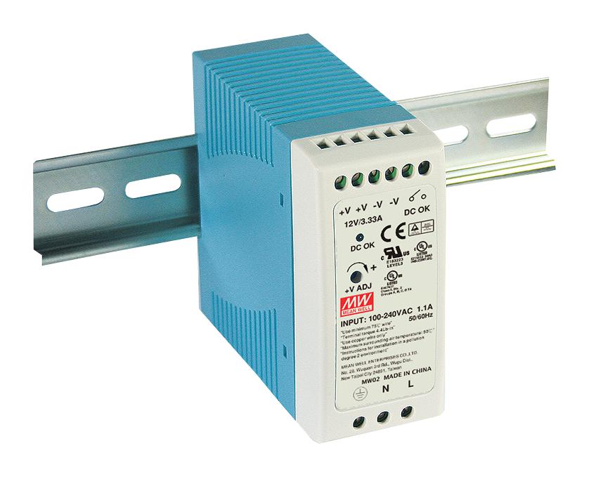 This is a AC/DC DIN Rail Power Supply (PSU), ITE, 1 Output, 40.8 W, 24 V, 1.7 A product from MEAN WELL with the model number MDR-40-24
