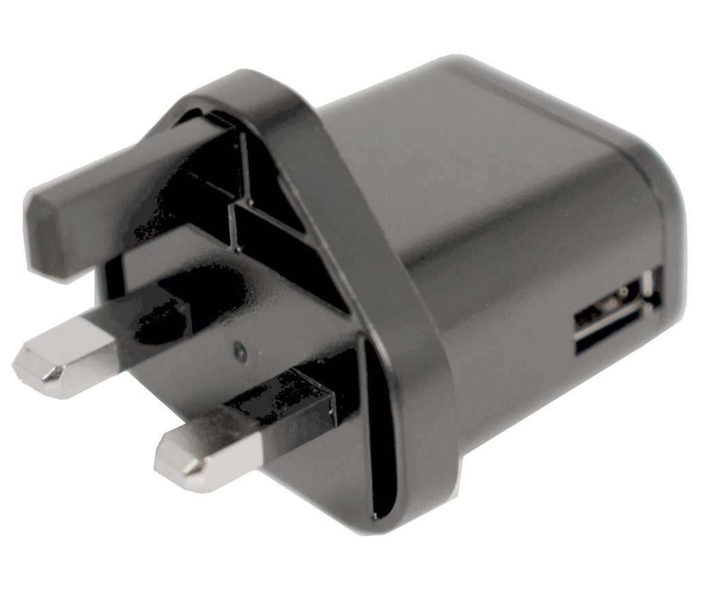 - Input connector is UK plug top, output connector is USB A socket