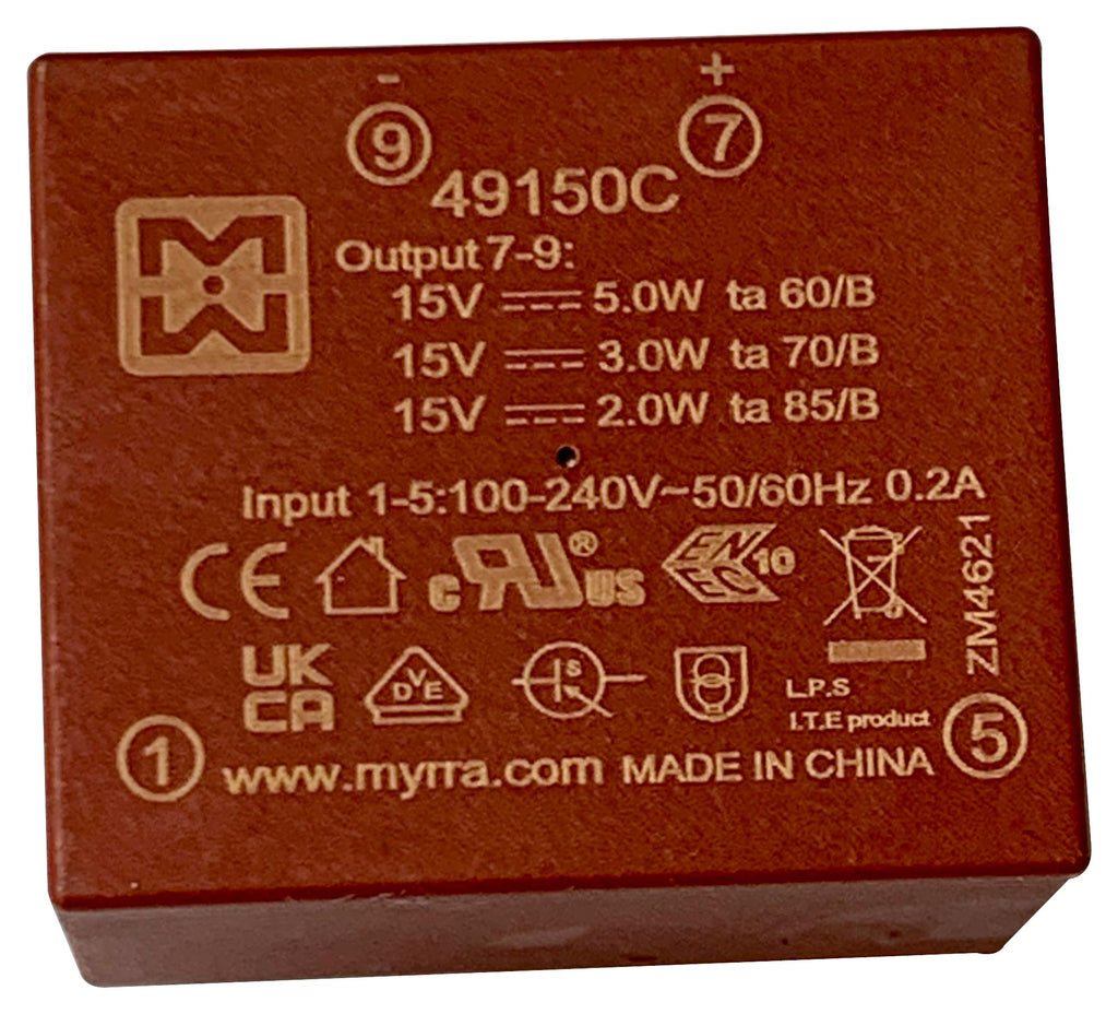 5W series regulated highly accurate AC/DC converter feature encapsulated design and same footprint as an EI30 transformer (upgrade your application without redesigning the PCB). It complies with EMC : conducted and radiated emission conform to EN55032, FCC part 15, CLASS B without any additional components. Immunity conform to EN61000-3-2 CLASS A, EN61000-3-3, IEC61000-4-2, IEC61000-4-3, IEC61000-4-4, IEC61000-4-5, IEC61000-4-6, IEC61000-4-11.