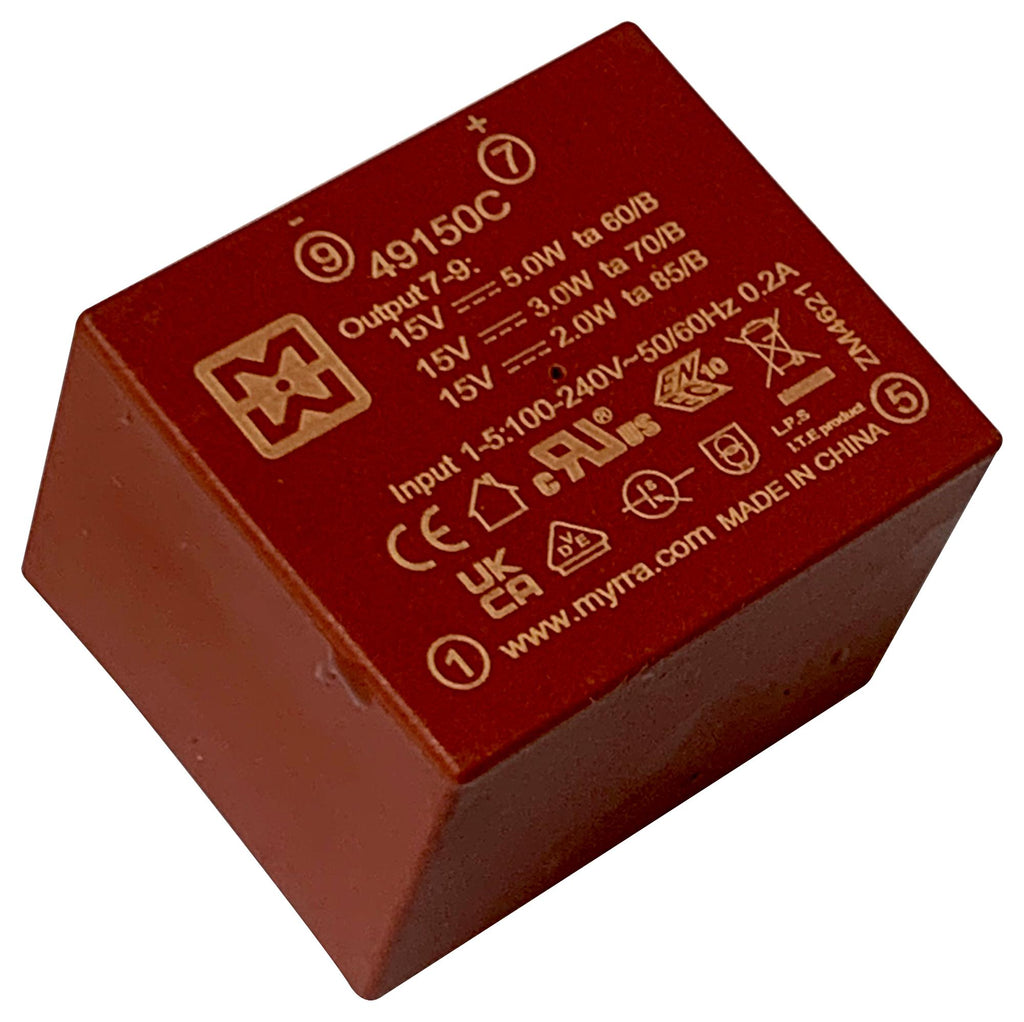 - 15VDC output voltage, 330mA output current at 5W, <gt/>77%@230VAC, 5W typical efficiency