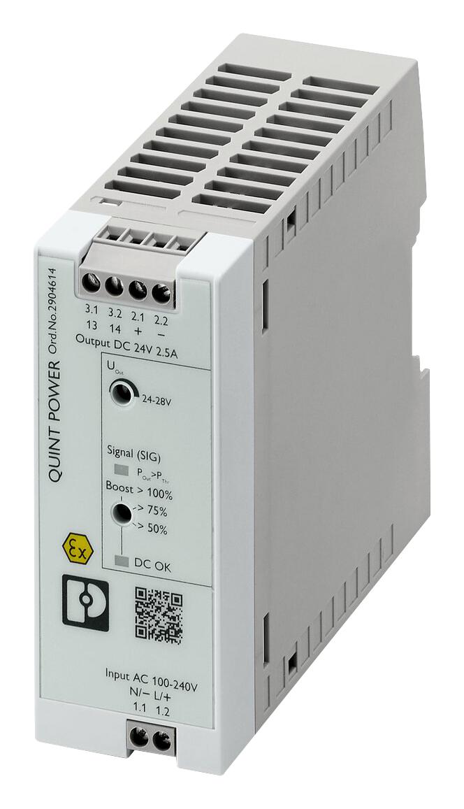 2904614 is a QUINT POWER primary-switched power supply with screw connection for industrial applications. The power reserve enables the easy extension of your system, as well as the trouble-free start-up of difficult loads. Static boost with sustained power of up to 125% is available for system extension. Dynamic boost of up to 200% for 5s enables you to start difficult loads.
