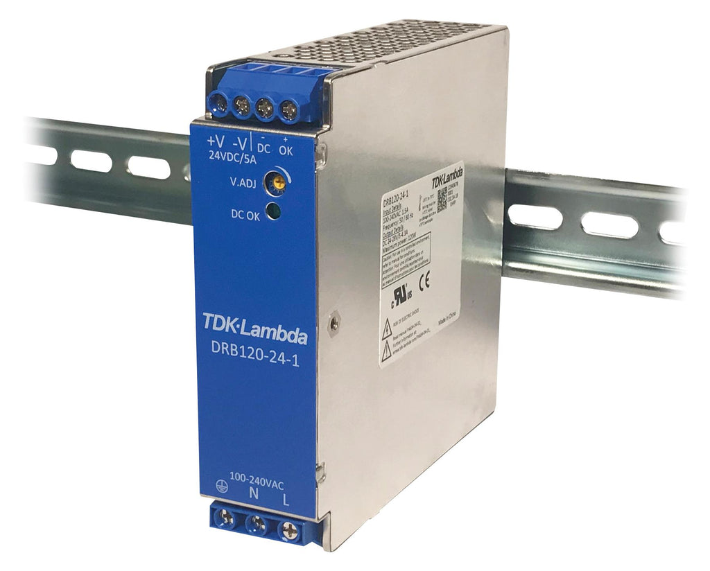 This is a AC/DC DIN Rail Power Supply (PSU), 1 Output, 120 W, 24 V, 5 A product from TDK-LAMBDA with the model number DRB-120-24-1