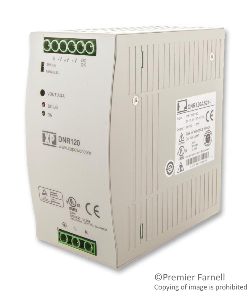 XP POWER DNR120AS24-I 120 Watt AC/DC DIN Rail Single Output Power Supply, Input 90V to 264V, Output 24V/5A