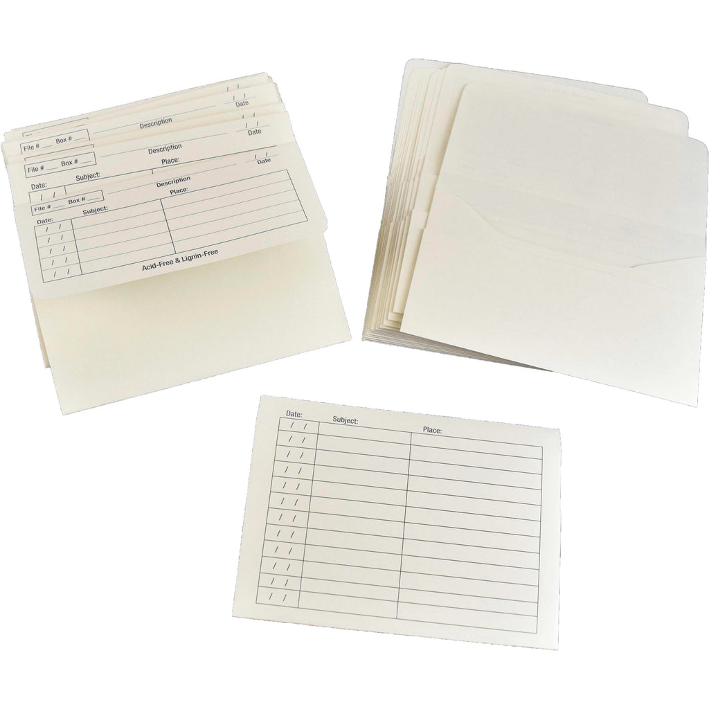 Archive your negatives and prints with this 25-pack of Archive Envelopes from Archival Methods. The cream-colored envelopes are made of a non-buffered 80 lb text paper that is acid- and lignin-free. Each envelope holds up to eight prints measuring 5 x 7". A separate interior pocket holds a roll of 35mm negatives cut into four-frame strips. The front flap of each envelope features a convenient index for important information such as time, place, and subject matter. The same information can be used as a cross-reference for digital files.