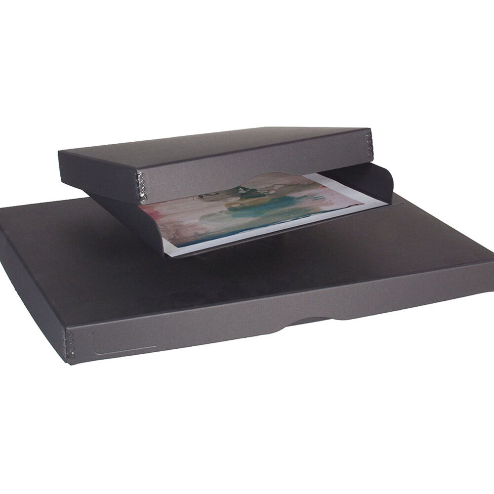 The black Drop-Front Archival Storage Box from Archival Methods protects and stores digital and photographic prints, matted or not, within its 1.5" deep hinged box. The box is constructed from heavyweight, archival-grade boxboard that has a matte-laminate coating for water resistance. Removing the box top reveals a hinged drop-front panel on the front long side so you can safely insert, remove, or examine contents in the the bottom section of the box.