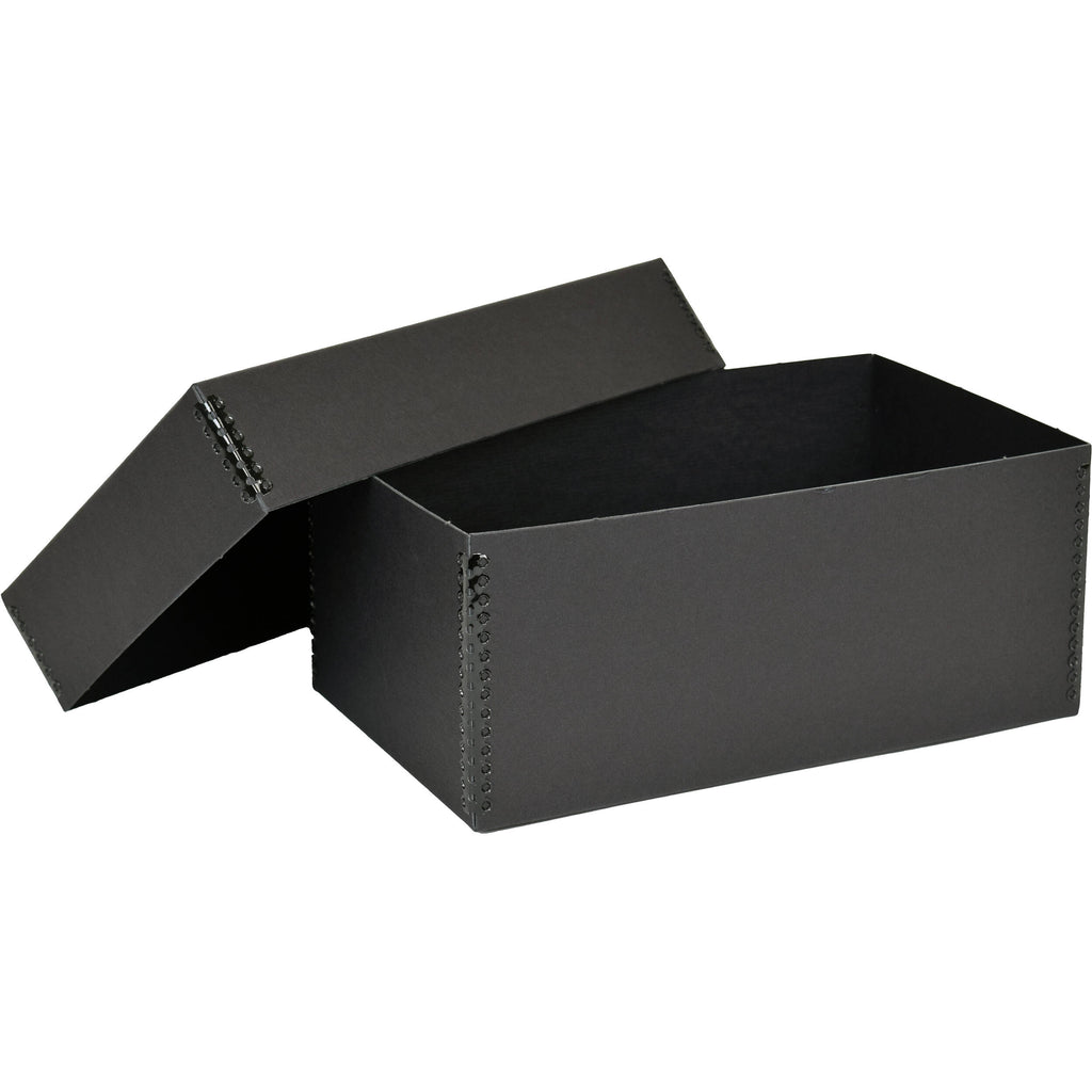 This black Archival Methods Short Top Box measures 10.5 x 6.5 x 4.5" and is designed for keeping your postcards, photos, CDs, and collectibles safe and protected in storage. Embossed areas on the box end and lid front are provided for adhesive labels. Metal clamps on the corners, treated with corrosion-resistant polyester, provide rigidity and stacking strength. The acid- and lignin-free archival-grade boxboard is made from fully bleached, high alpha cellulose pulp with no post-consumer-waste recycled pulp, metal particles, waxes, plasticizers, residual bleach, or peroxide, and the sulfur content is less than 0.0008% reducible sulfur. Archival Method's short top boxes have removable, close-fitting lids to seal out dust and contaminants.