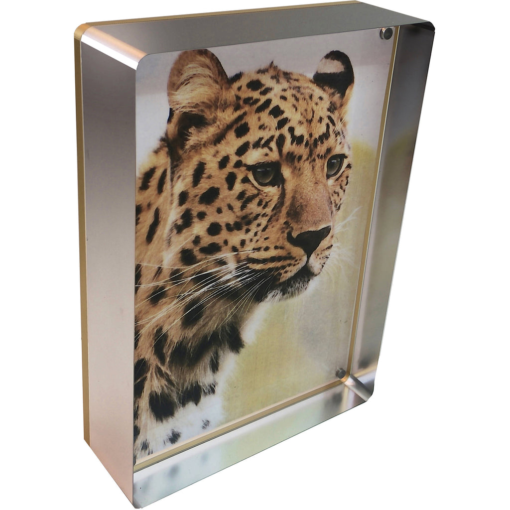 Constructed from durable acrylic, the frame's panels are easily cleaned with a soft, dry cloth. When combined, the front panel and rear panel create a frame that features distinctive, slver-colored edges that are 1.8" deep. Installed photos sit toward the rear of the frame, with a front-facing photo most accentuated by the color and depth of the edges.