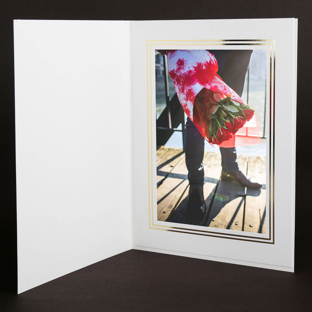 This 25-pack of white Premier Photo Folders from National Photo Folders can fit a 4 x 6" print per folder. The inside of the folder has a full one 1" border with two gold stamped accent lines for the image, which makes for a beautiful display. Each folder has two glue lines to hold the photograph firmly in place.