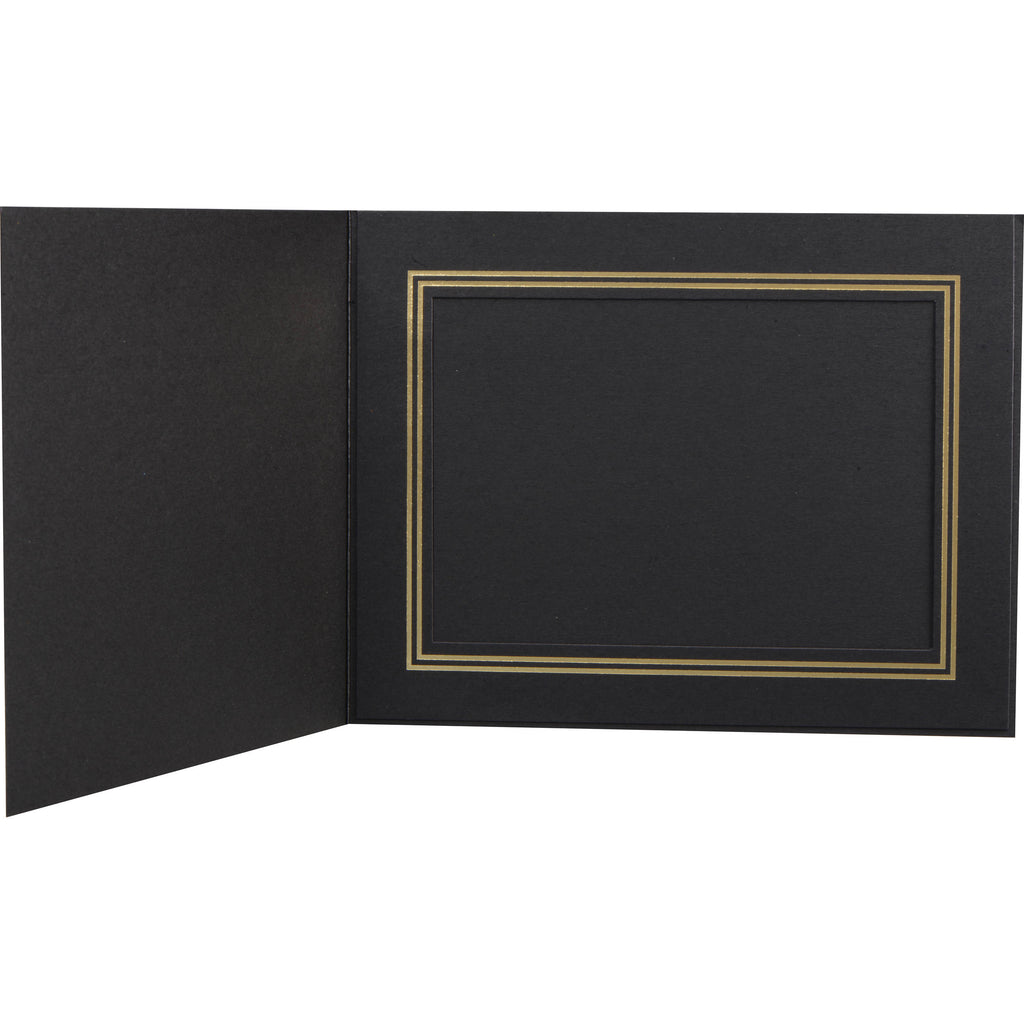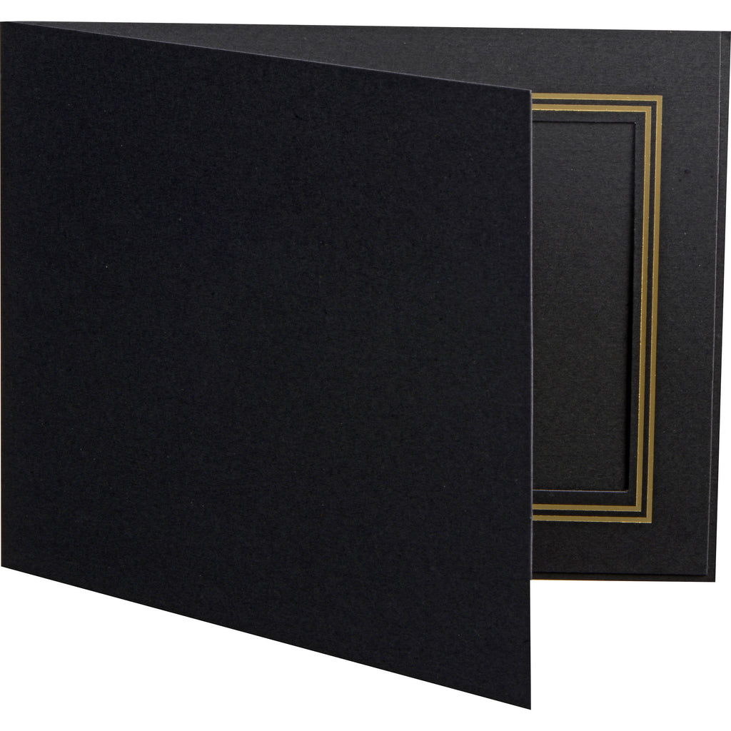 This 25-pack of black Premier Photo Folders from National Photo Folders can fit a 7 x 5" print per folder. The inside of the folder has a full one 1" border with two gold stamped accent lines for the image, which makes for a beautiful display. Each folder has two glue lines to hold the photograph firmly in place.
