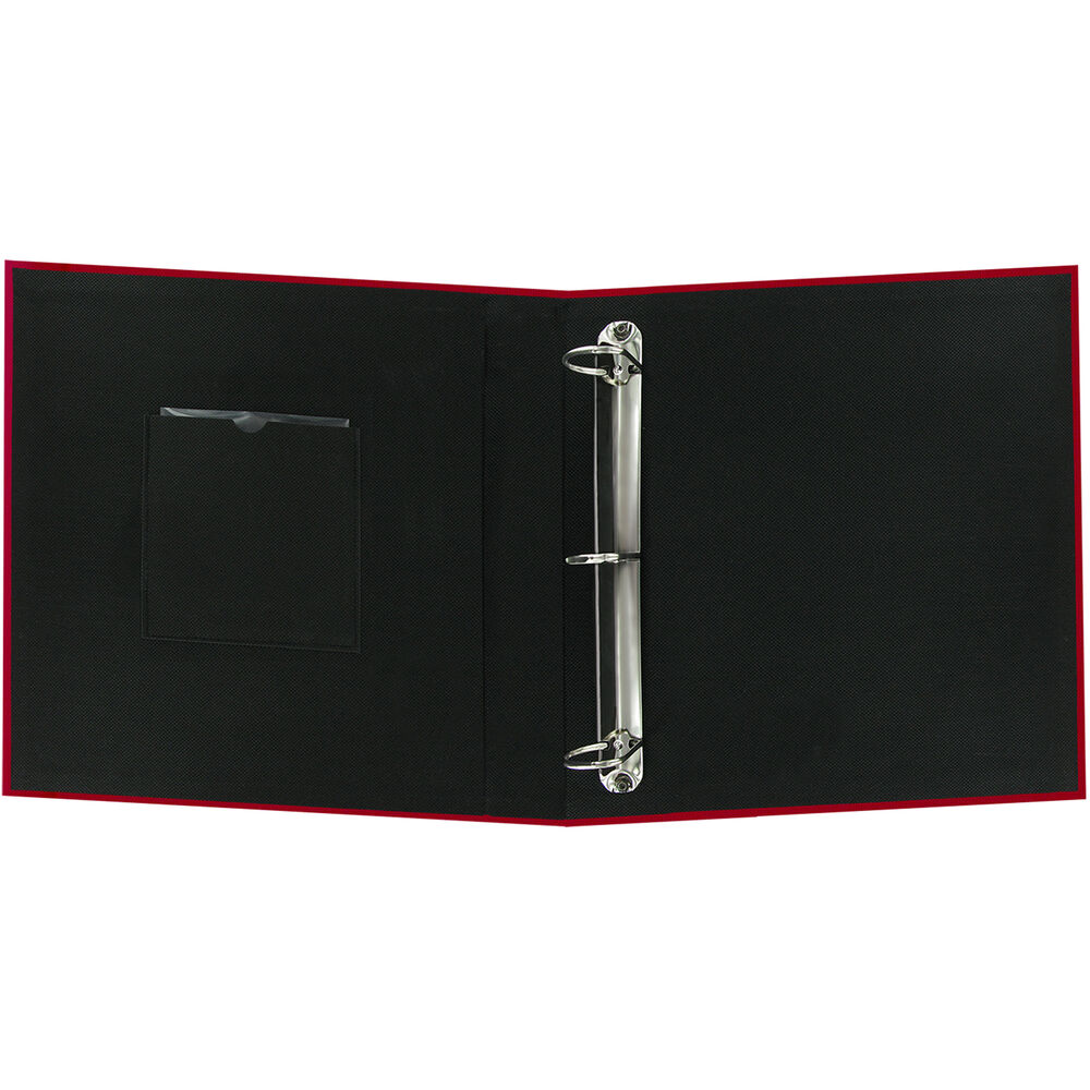The 3-Ring Binder Scrapbook from Pioneer Photo Albums has a deep red fabric cover with a frame for a 3.5 x 3.5" photo and is designed to display and protect 8.5 x 11" memorabilia. This book will accommodate most optional 3-ring sheet protectors up to 10.5 x 11.5".