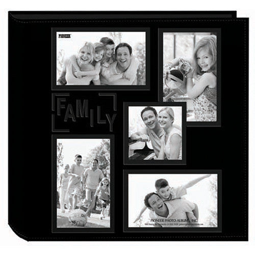 The Pioneer 5COL240 Collage Cover 4x6" Family Photo Album features a black leatherette cover and is designed to display and protect 200 4x6" photos. The 3-up style pages, including the cover, can display three horizontal or two vertical images per side.