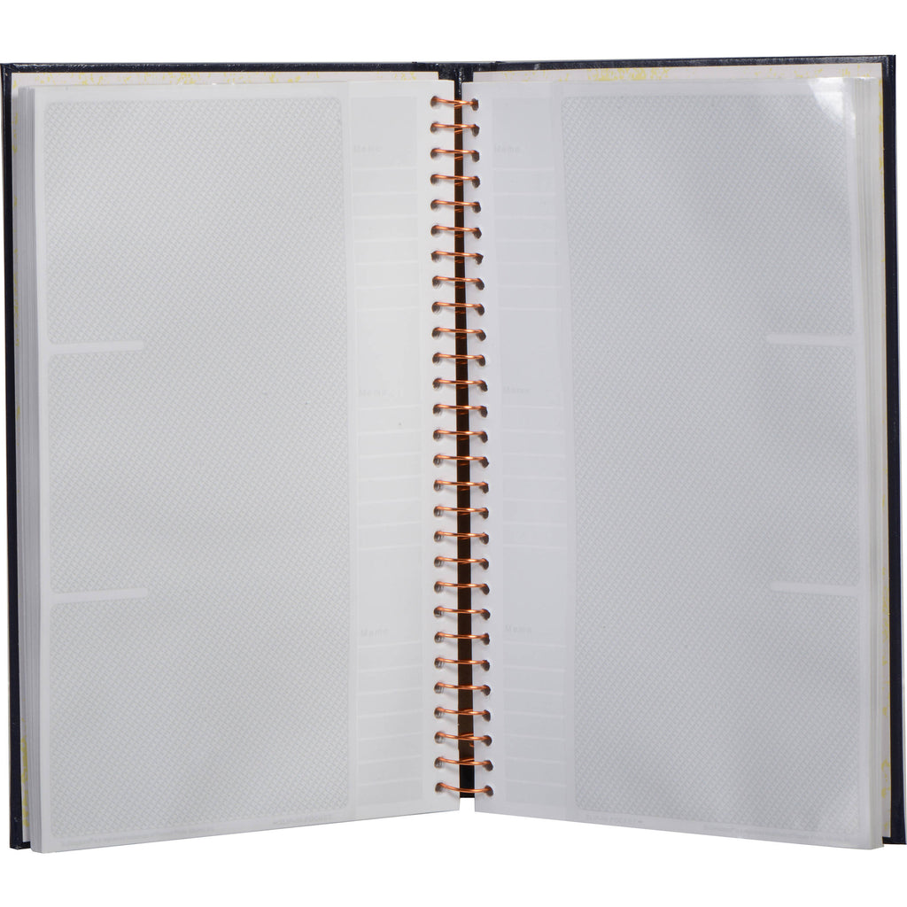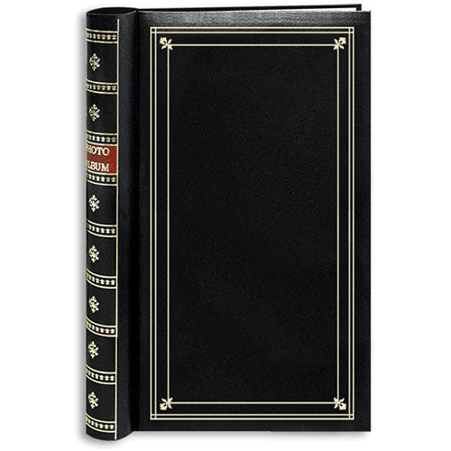 The black Pioneer BDP-35 Photo Album is designed to display and protect 300, 4x6" horizontal photos as well as panoramic images. Each of the clear side-loading 50 bi-directional pages has a shaded background to hold either 3 horizontal or 2 vertical shots per side. The book-style binding enables the open pages to lay flat for quick loading and optimal viewing. A memo area next to each photo allows you to notate important information. The washable leatherette album has gold accents and is acid-free for archival, long-term storage of your photos.