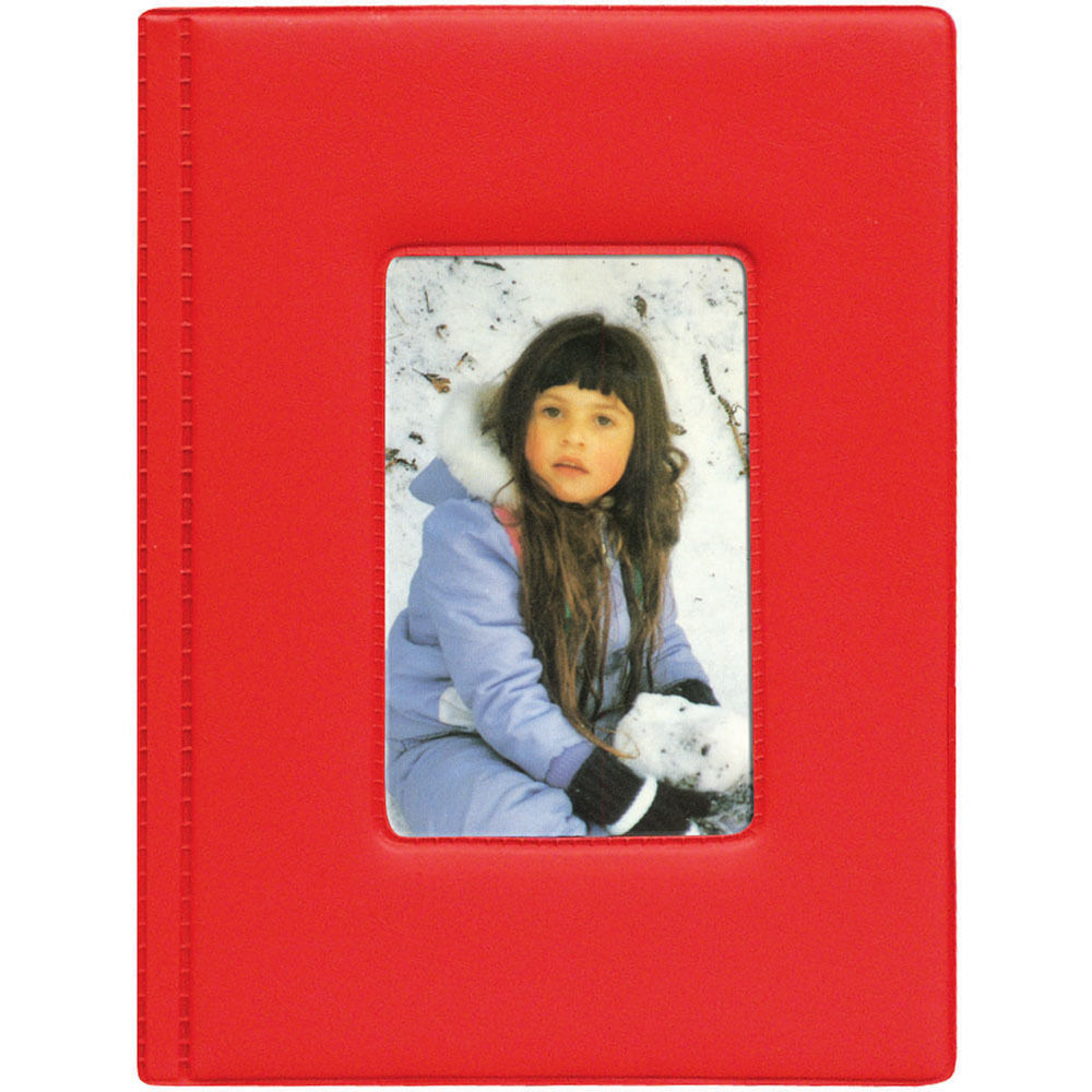 The Pioneer KZ-46 Frame Cover Album features a padded red plastic cover and is designed to display and protect up to 24 4x6" photos. The 1-up style pages can display one vertical image per side. There is a 2.0 x 3.5" cover window for a theme image inserted through a pocket inside the album's front cover.