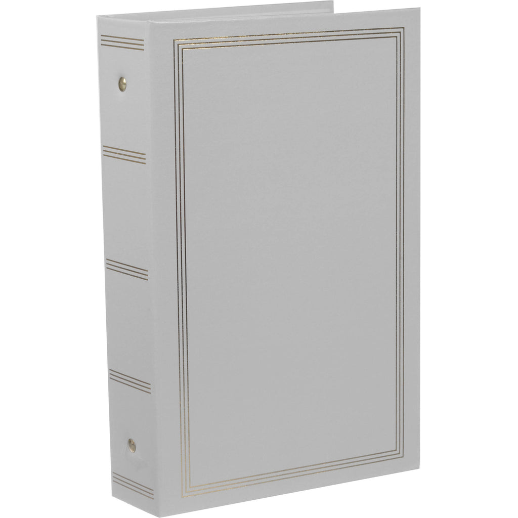 The Pioneer STC-46 Pocket 3-Ring Binder Album features a white leatherette cover with gold accents and is designed to display and protect 300 4x6" photos. The 3-up style pages can display three horizontal images per side.
