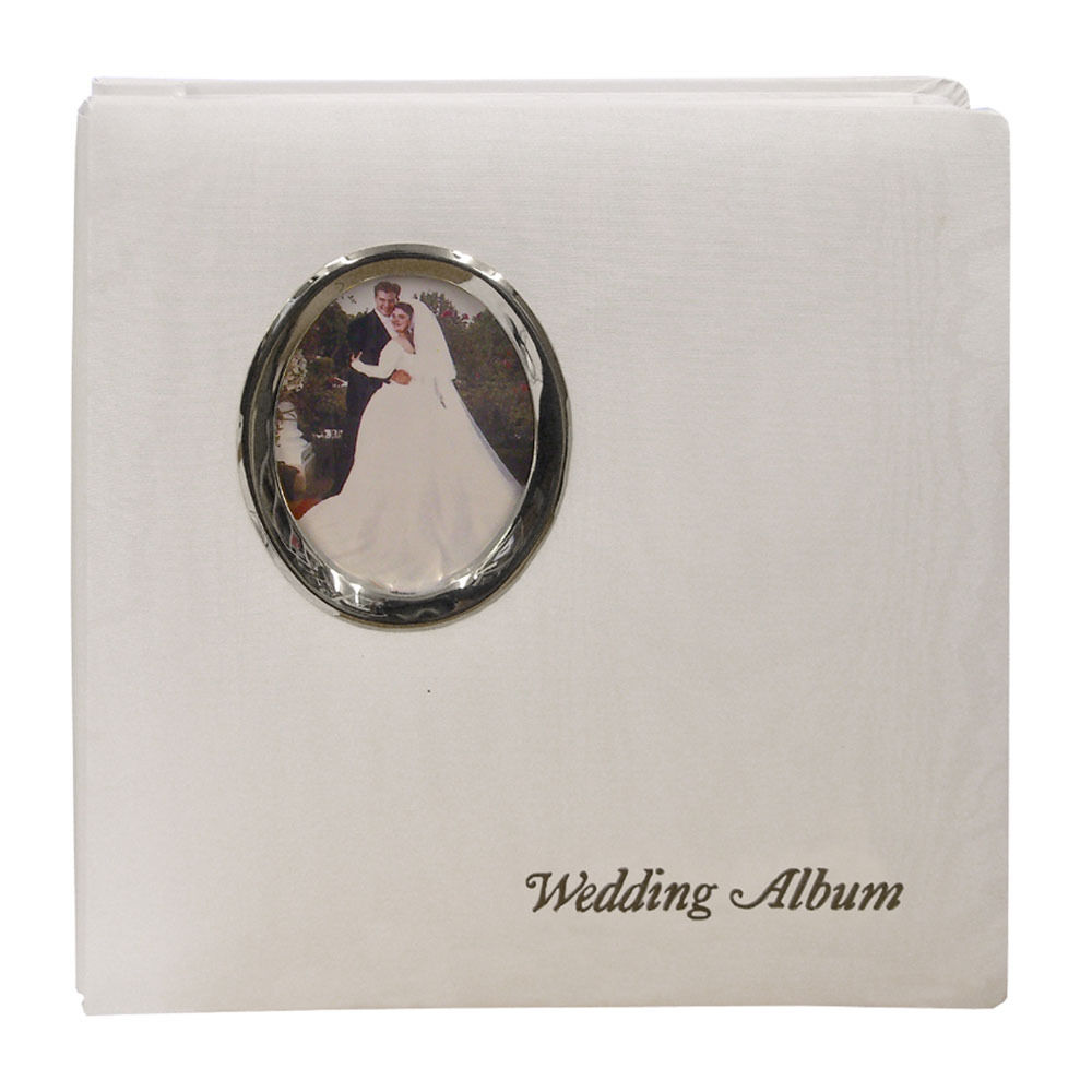 The Pioneer WF5781-ST Oval Framed Wedding Album features a white moiré fabric cover with silver oval frame, inscribed "Wedding Album", and is designed to display and protect 100 5x7" and 4 8x10" photos. The 2-up style pages can display two 5x7" horizontal or one 8x10" vertical image per side.