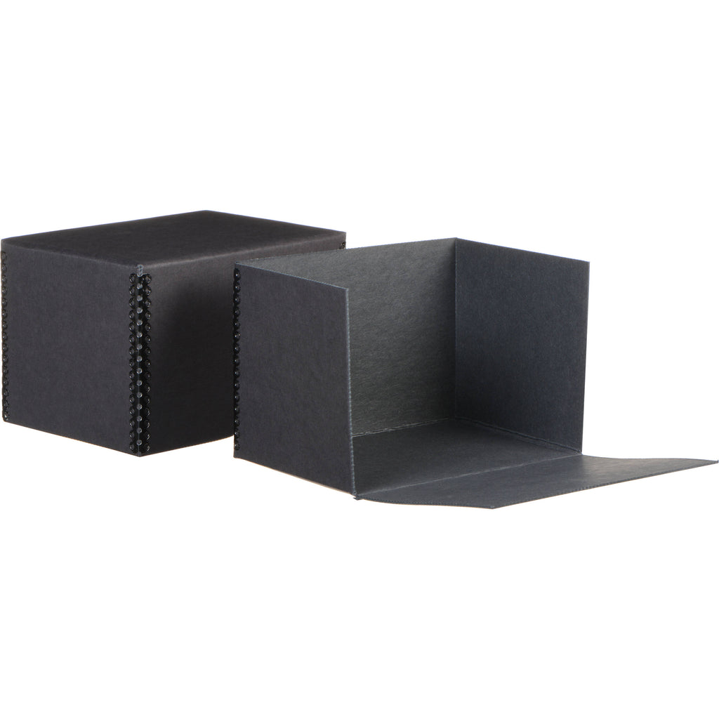 With rectangular dimensions of 4.5 by 6.5" and a depth of 4.5", this black Drop-Front Metal Edge Archival Storage Box from Print File can hold up to 450 unsleeved prints inside. Its two front corners are reinforced with black metal edges, which prevent the pack from being crushed if you decide to stack several boxes on top of one another. Removing the lid allows the front edge to drop, allowing for easy insertion or removal of contents.