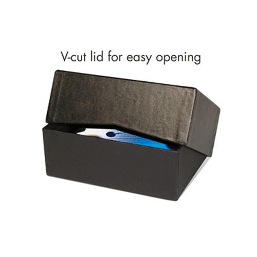 The Film & Print Box is two separate pieces with a removable lid, which both are made from a heavy-duty 0.098 binders board. The box has a black material exterior, and the interior is lined with a buffered acid- and lignin-free black paper. Because of the depth of the box, there are v-cut notches on the sides of the lid, which allows the lid to be removed easily from the box. Furthermore, the entire box was constructed using a neutral pH adhesive, which maintains a neutral pH level between 8.0 to 9.0, and it makes the box suitable for long-term storage.