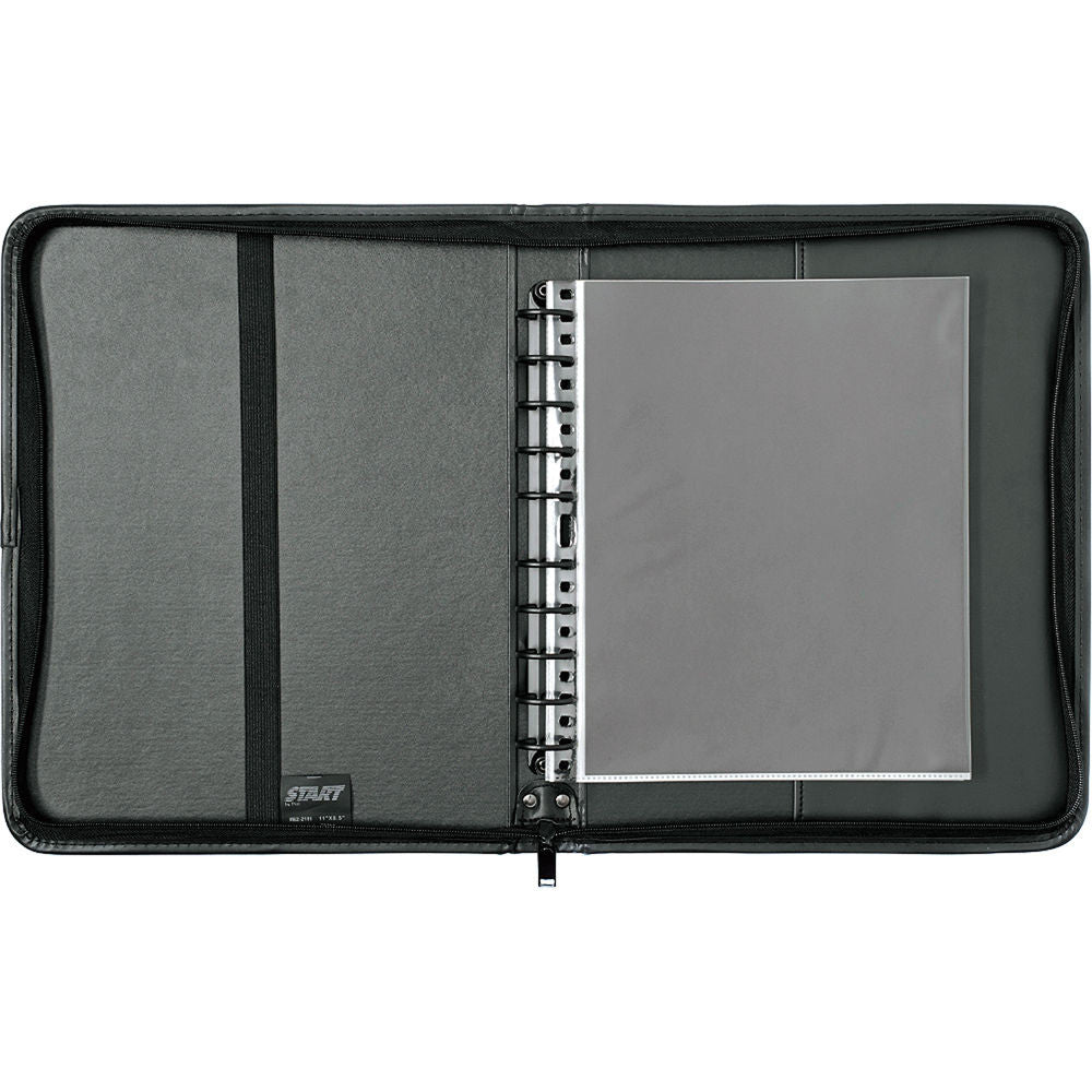 The cover is made from a laminated black waterproof cover with a fine, elegant lining. The included 10 pages are held in place and substituted using the black 1" multi-ring mechanism that prevents the pages from snagging. When carrying the case, the improved spine mounted handle allows the pages to hang flat so there's no worry about them wrinkling. An inside storage pocket is provided for collateral material such as your resume or business cards.