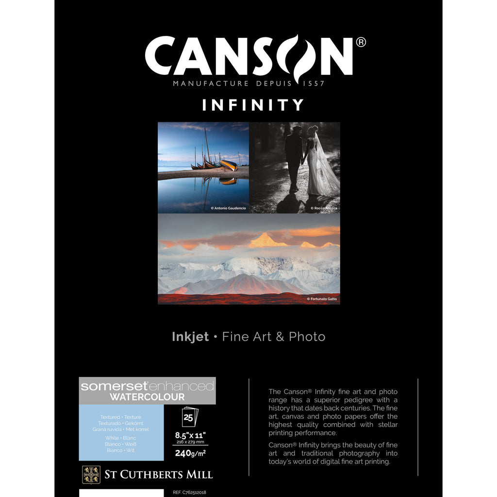Offered here in a 25-pack, this 8.5 x 11" Somerset Enhanced Watercolor Paper from Canson Infinity offers you the ability to create a photograph with the true look and feel of a traditional darkroom print. It features a 100% cotton rag, which offers exceptional contrast and detail as well as a wide color gamut. The paper has a soft, refined feel to the touch and the textured surface offers printmakers, artists, and photographers a painterly feel to the final print.