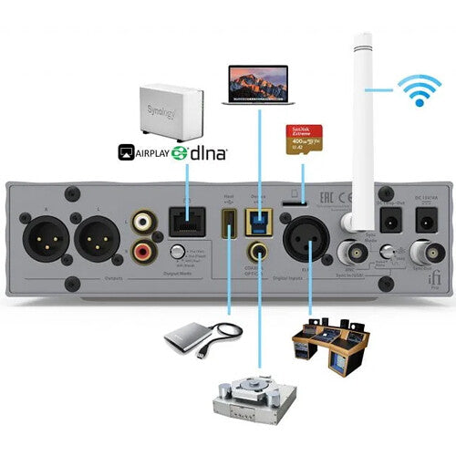 - In addition to its traditional inputs, the Pro iDSD Studio integrates a Wi-Fi/network playback system using linkplay DLNA and Airdrop to access streaming from MacBooks or streaming services such as Tidal.