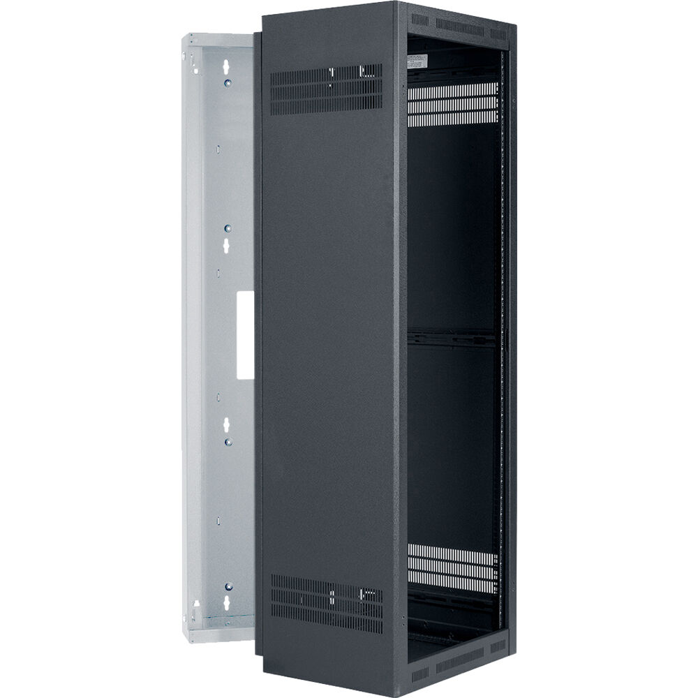 Wall-Mounted 35 RU Deep Rack (Cabinet Only) by Lowell Manufacturing fastens to a wall or a Lowell wall-mounted back box, available separately. This 35 RU cabinet has mounting points on the rear that are spaced 10" apart to accommodate wall obstructions such as a fuse box. When fastened to a separately available back box the cabinet swings 90° outward, providing easy access to the rear or your server. Fully gusseted corners and an optimal airflow design make a smooth appearance that keeps your components cool. Take advantage of top and bottom laser-cut knockouts for installing accessories and cable management. The 300 lb weight capacity safely holds your equipment. A powder-coated steel finish construction is durable and withstands the wear and tear of daily use.