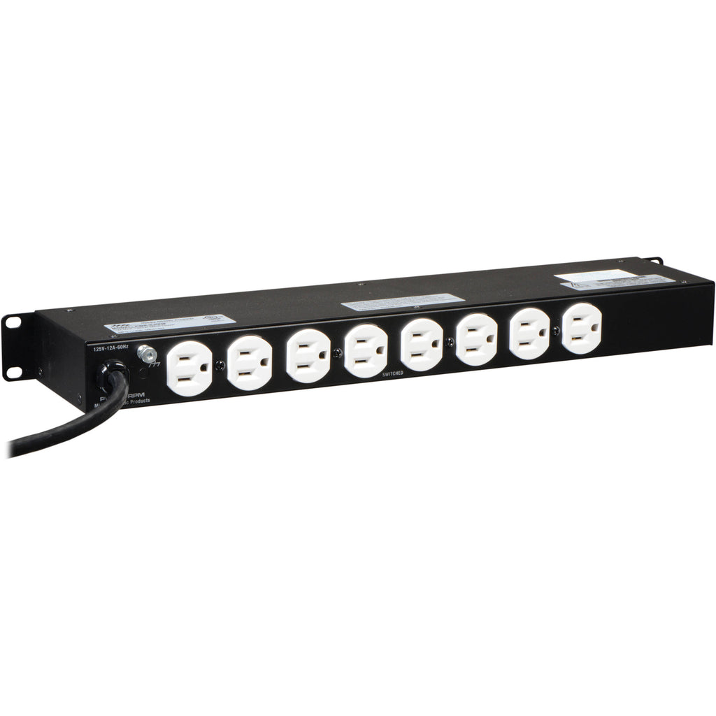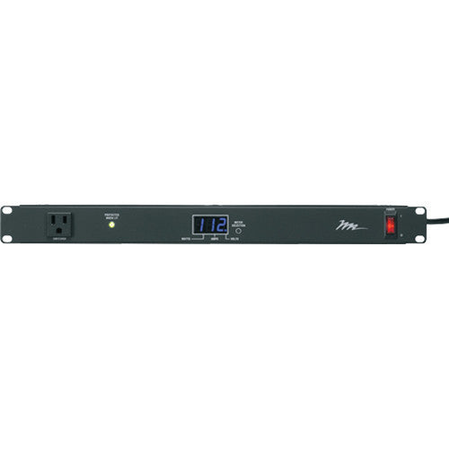 The PWR-9-RPM from Middle Atlantic is a compact 15A, 1U rackmount power distribution center featuring 9 outlets, surge protection, filtering, and metering. The PWR-9 includes a fixed 9' cable with a standard NEMA 5-15P plug, while the surge protector offers a line to neutral design, which not only protects, but offers filtering for noise elimination. The meter displays current, voltage, and power draw, while the built-in circuit breaker prevents overloads.