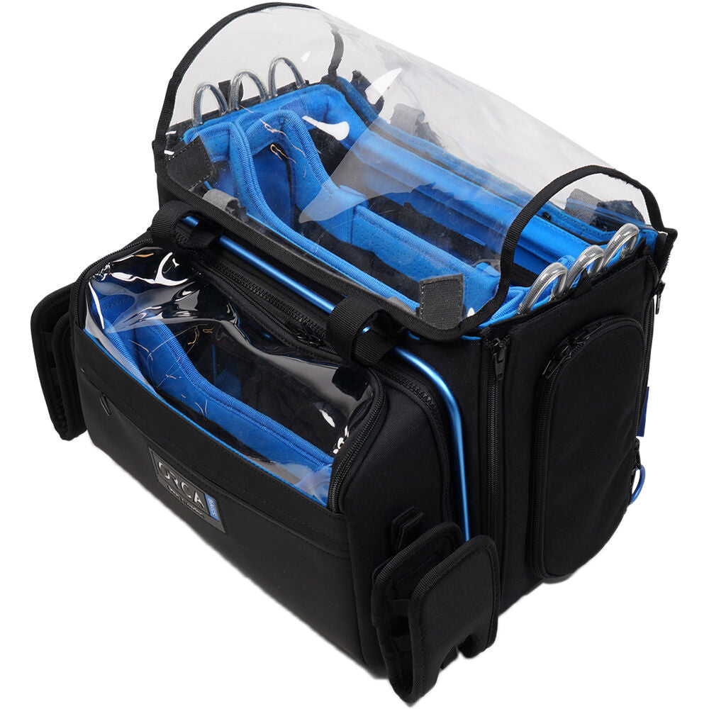 The bag's angled profile offers fast and easy access to all your gear from all six sides, while the bright-blue polyester lining provides easy viewing of the equipment. A dedicated battery compartment keeps your battery safely in place and easily accessible. Two straps allow you to hold a folded boompole on top of the bag.