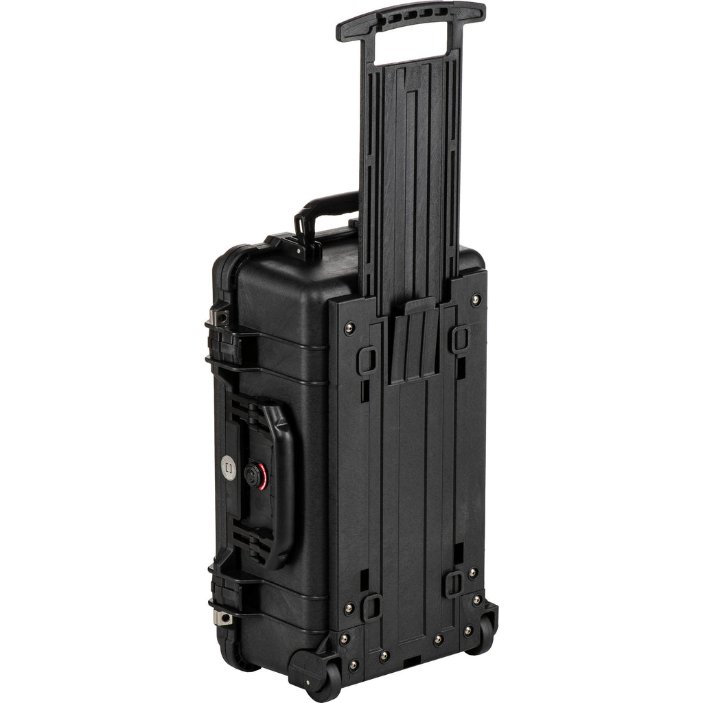 The case has long side handles, a long front handle, a retractable extension handle, and strong polyurethane wheels with stainless steel bearings. It has an effortless release latch for the extension handle.