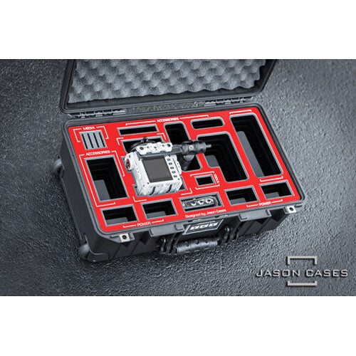 Jason Cases designed the high-grade laser-cut foam for this Pelican Case to hold the RED KOMODO camera in a Tilta cage with a PL or RF mount and outrigger handle attached. The handle can also be removed from the camera and stored in a separate space.