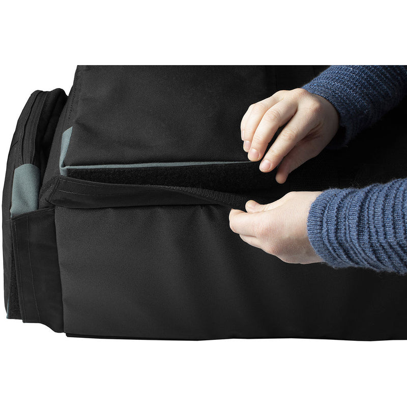 Access to the interior of the case is afforded by Porta Brace's Quick-Zip dual-zipper opening, which provides access to the entire interior of the case. The zippers are sewn into the case with reversed facings to extend the life of the zipper and help prevent snagging. The handles and padded shoulder strap are wrapped in suede for comfort and long life. The exterior bottom is lined with anti-skid material that is easy to clean and provides protection against water, dirt, and grime. The two included removable pockets use hook-and-loop fabric to attach to either end of the case.