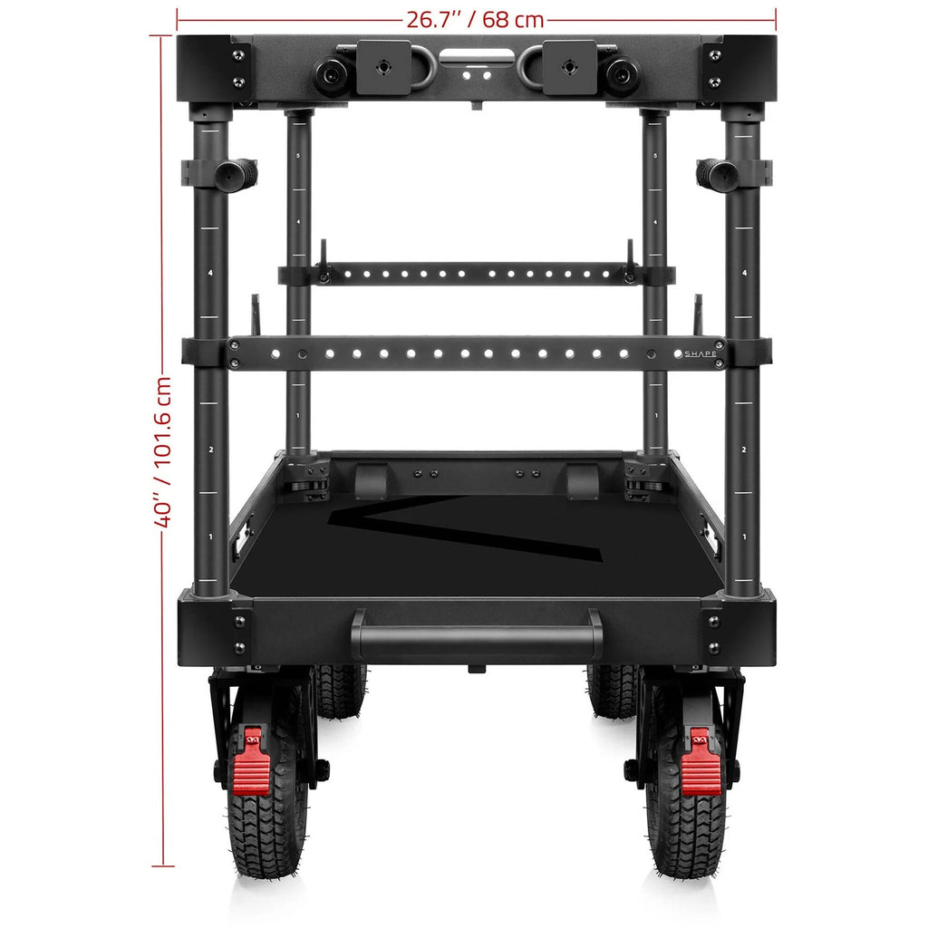 Measuring 26.7 x 45.5 x 40", the SHAPE Wagon 40" Camera Cart is an equipment cart designed to carry camera gear, tools, and accessories in the studio and on location. The cart requires no tools for assembly/disassembly, so you can build or break down the cart with ease. The shelves have glass-filled nylon corners for stability. The Wagon features 1/4"-20 and 3/8"-16 screw theads on the front fence. The cart and its wheels collapse to a compact flight-case form that measures 6.8" thick, with a travel handle, integrated rolling wheels, and a spring-loaded latch system. In its flight case form, the cart becomes portable and easily transportable. The cart's adjustable handles simplify movement up curbs, entryways, and inclines.
