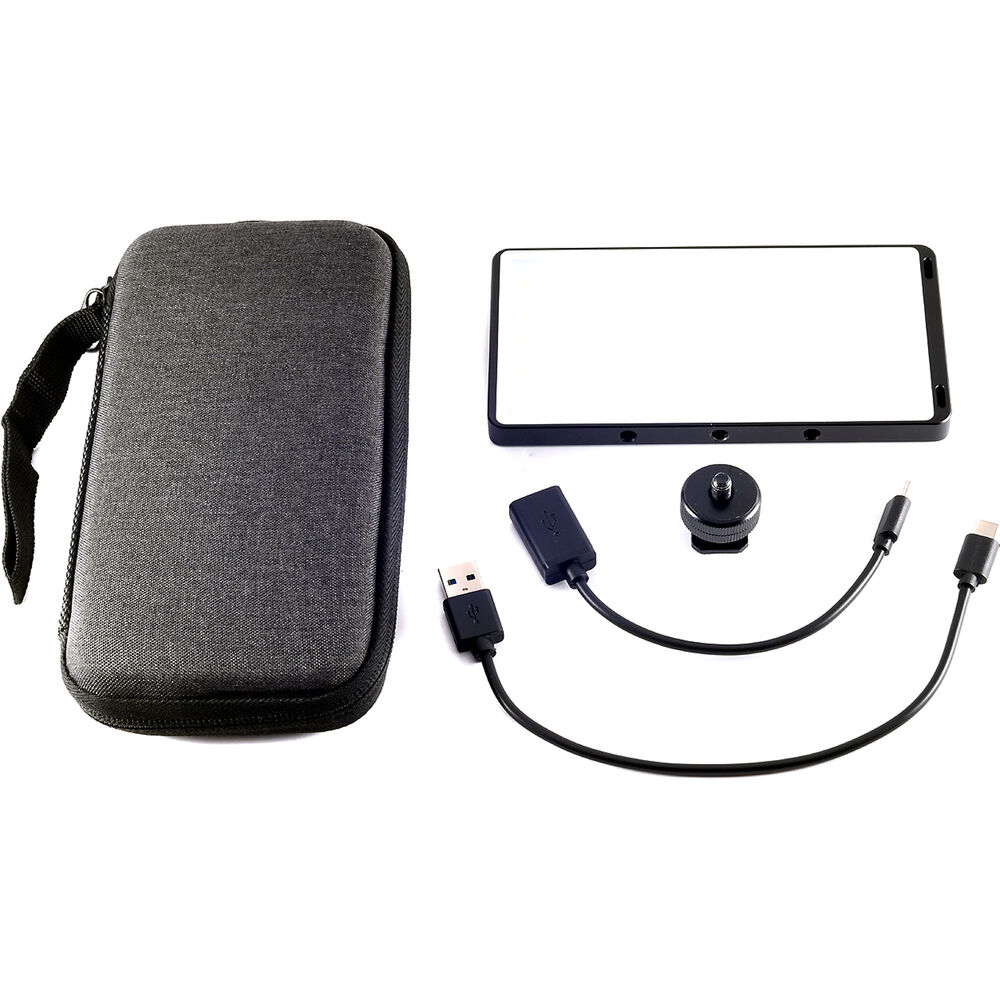 The integrated battery charges via a USB Type-C port, which can also charge other devices when used as a power bank. The fixture has a built-in on/off switch and an LED display that shows you the charge status of the internal battery, as well as the dimming and color temperature settings. Items included with the fixture are a carry case, shoe mount, USB Type-A adapter cable, and charging cable.
