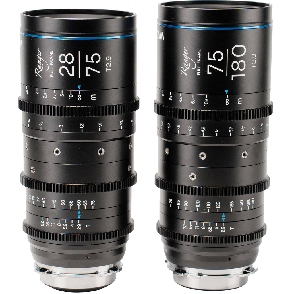 This Laowa Ranger T2.9 Full Frame Cine Zoom 2-Lens Kit from Venus Optics outfits you with two zoom lenses with varying focal lengths suited for full-frame shooting with ARRI PL and Canon EF cameras. Both the 28-75mm and 75-180mm lenses feature a maximum aperture of T2.9, 11 aperture blades, and 77mm filter thread. Mirrored 0.8 MOD gearing for the focus, aperture, and zoom rings on both lenses allows you to use the same follow focus or zoom system without needing to adjust when you switch out your lens.
