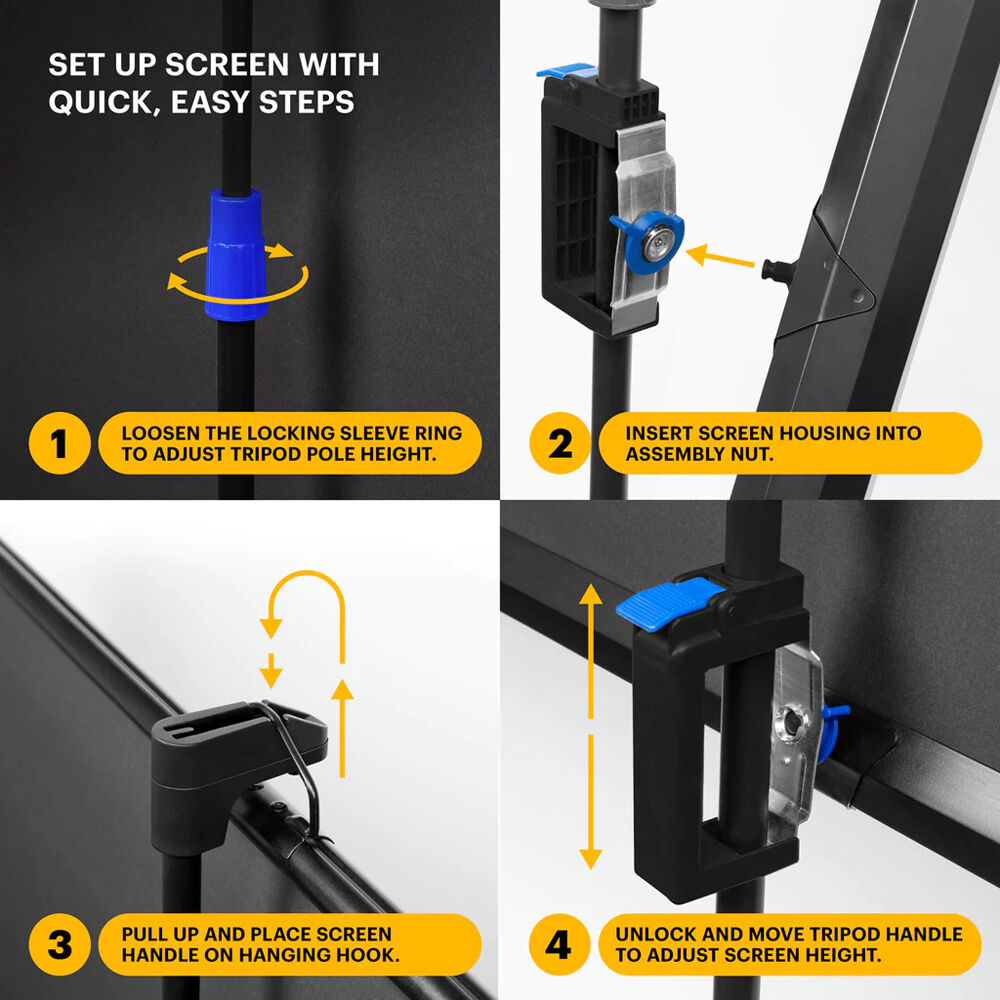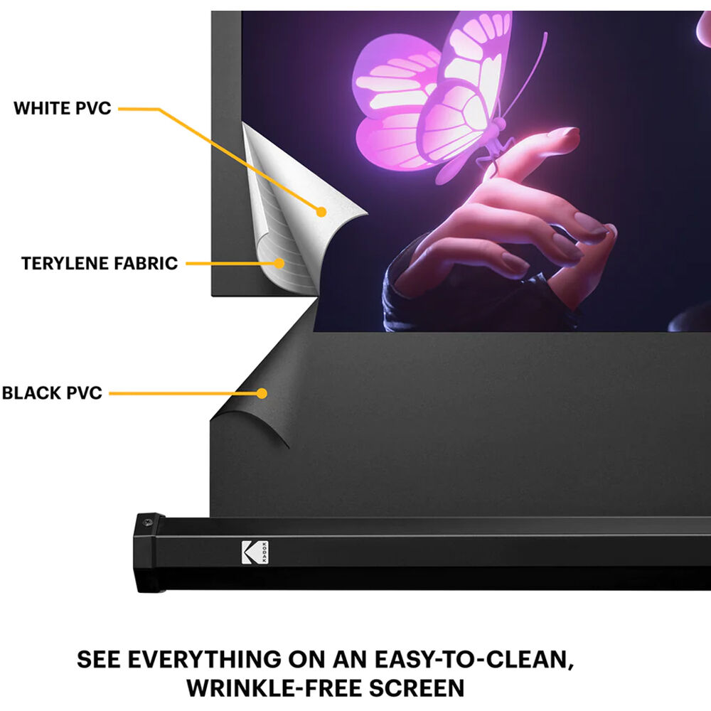 This tripod projector screen uses a matte white PVC, Terylene fabric front with black borders, and a black PVC backing to prevent light bleed and enhance contrast. The matte white finish is compatible with all projector types and is easy to clean.