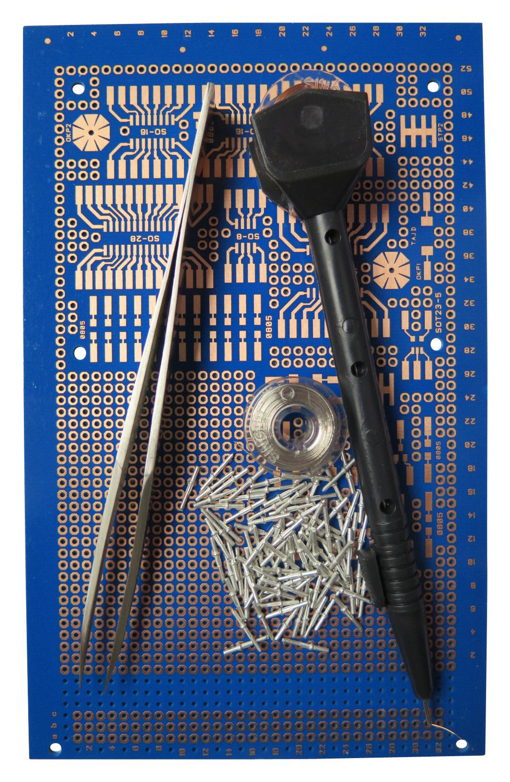 Contentsx1 Wiring Pencil with brake and bobbin of Solderable Enamel Wire x1 MP005895 SMT single height, single sided Eurocard combined with Oktapad® format, (160mm×100mm) x1 Tweezers - AA Type x100 Double Sided Solder pins, 1.0mm dia x1 Bobbin of Tinned Copper Wire - 0.25mm dia. (non-insulated) x1 Board format and SMD footprint list x1 Guidance Notes: Surface Mount Technology PCB Formats & Hand Wiring & Soldering Surface Mount Devices