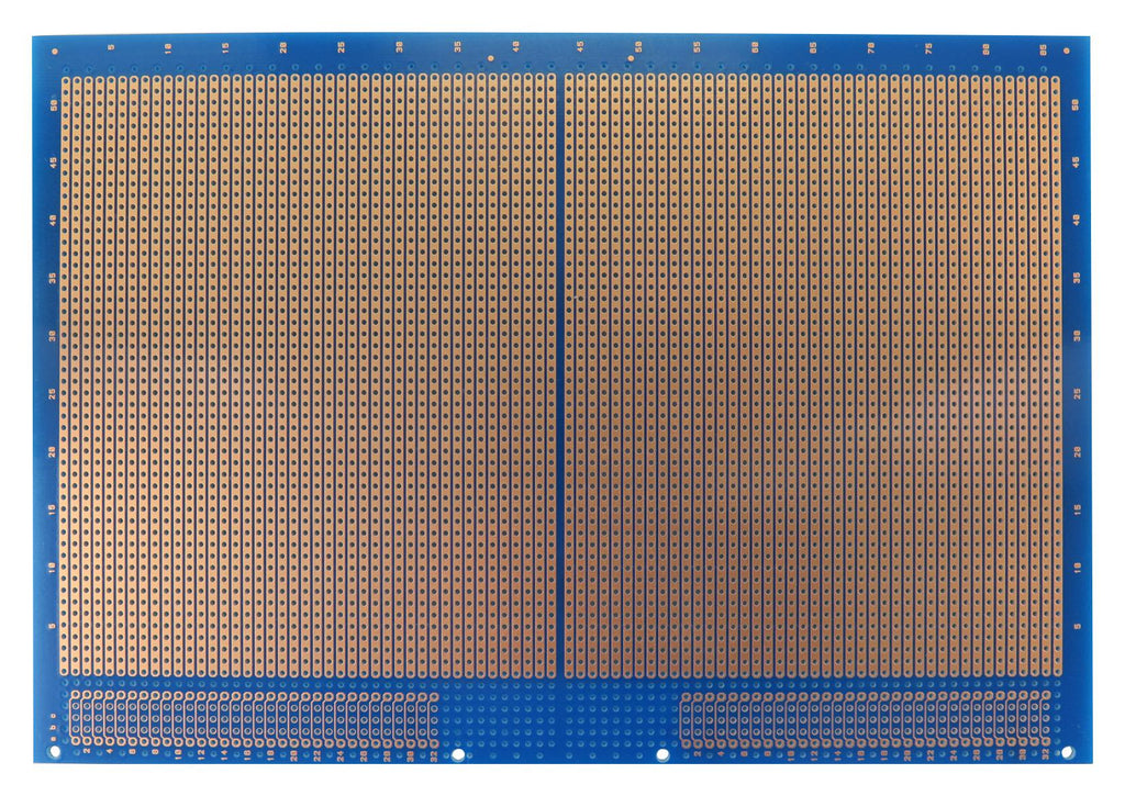Universal Eurocard prototyping PCB board with unique Oktapad stripboard format. The board is designed to accomodate wire wrapping and discrete component wiring techniques. The board provides a silkscreen reference on the component side and a colander ground plane for maximum screening.