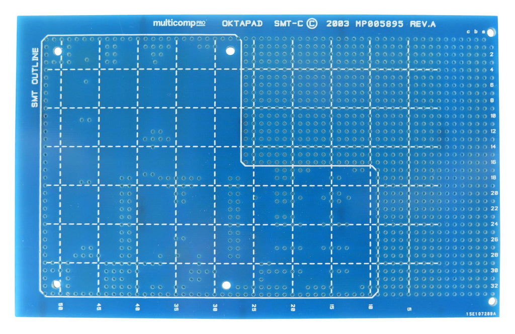 Experimental development board with Oktapad format that is designed to facilitate wiring SMDs (Surface Mount Devices) with conventional components. The board contains popular SMD footprints with fan-outs and easy-to-wire solder pads, as well as holes to attach a piggy-back board if required.