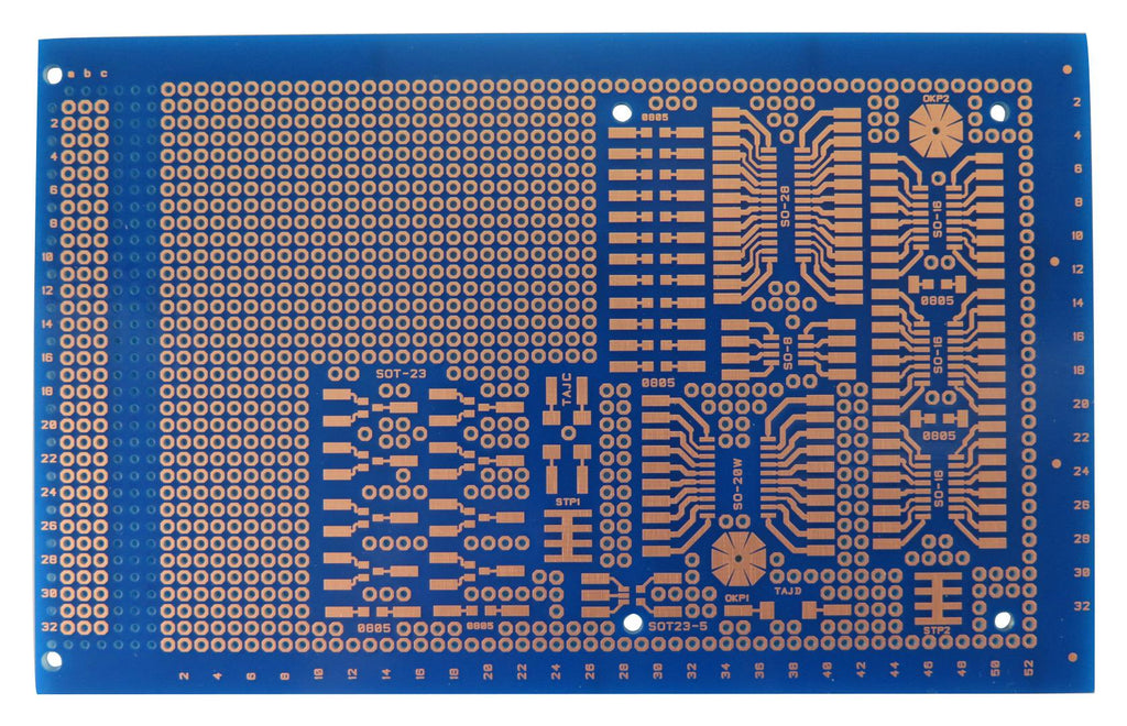 - Contains popular SMD footprints with fan-outs and easy-to-wire solder pads