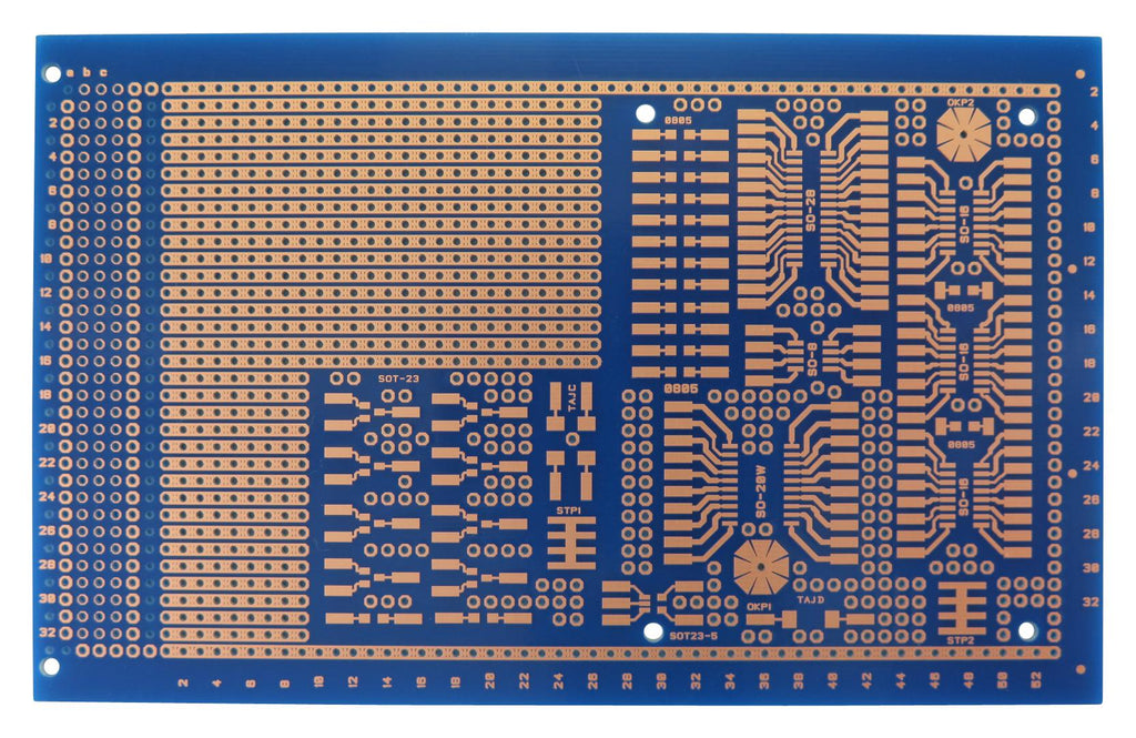 - Contains popular SMD footprints with fan-outs and easy-to-wire solder pads